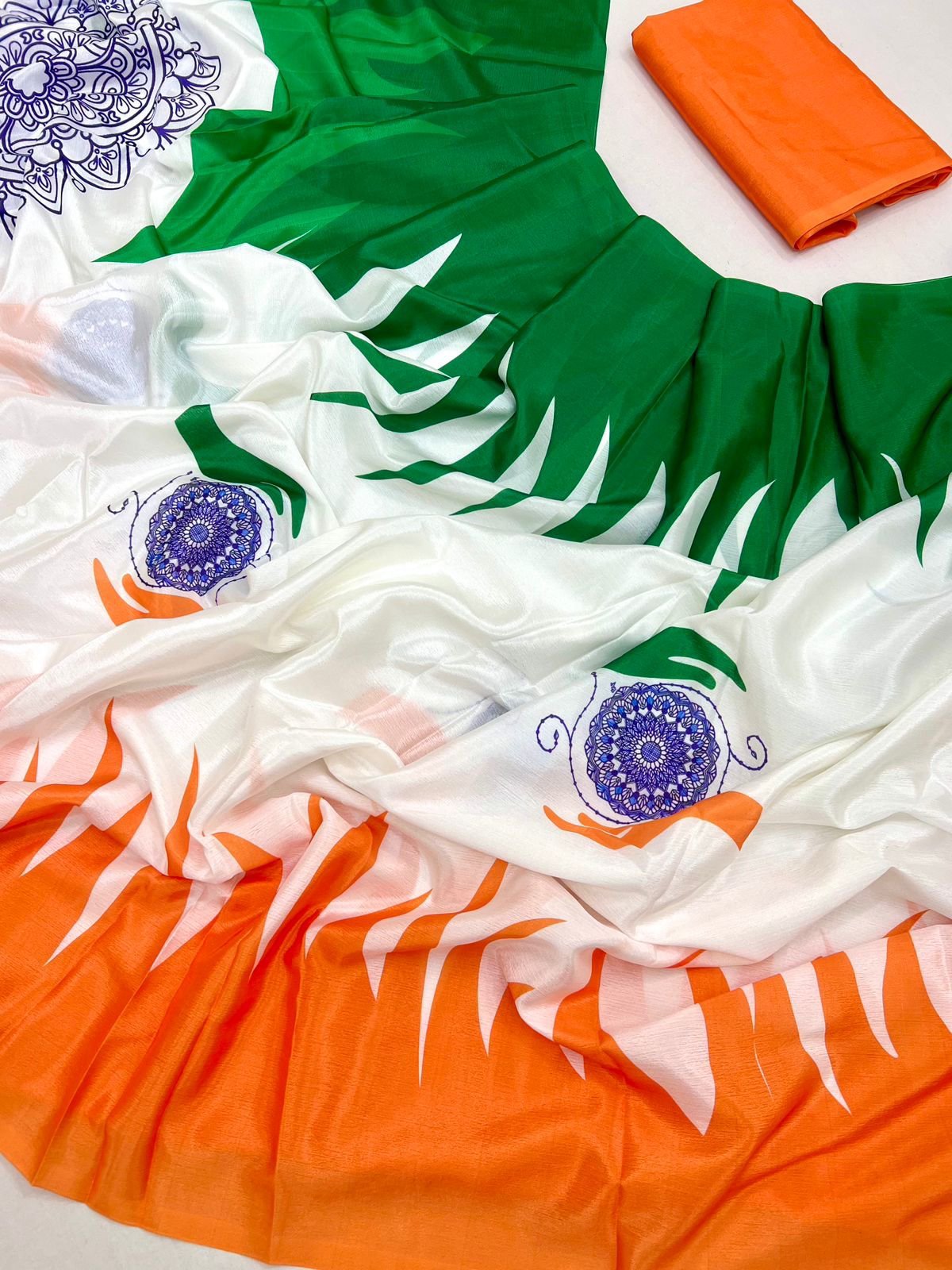 Celebrate 15 August with this Tiranga Chinnon Silk Saree featuring tricolor digital print & contrast blouse. Festive, patriotic & elegant. Limited stock!