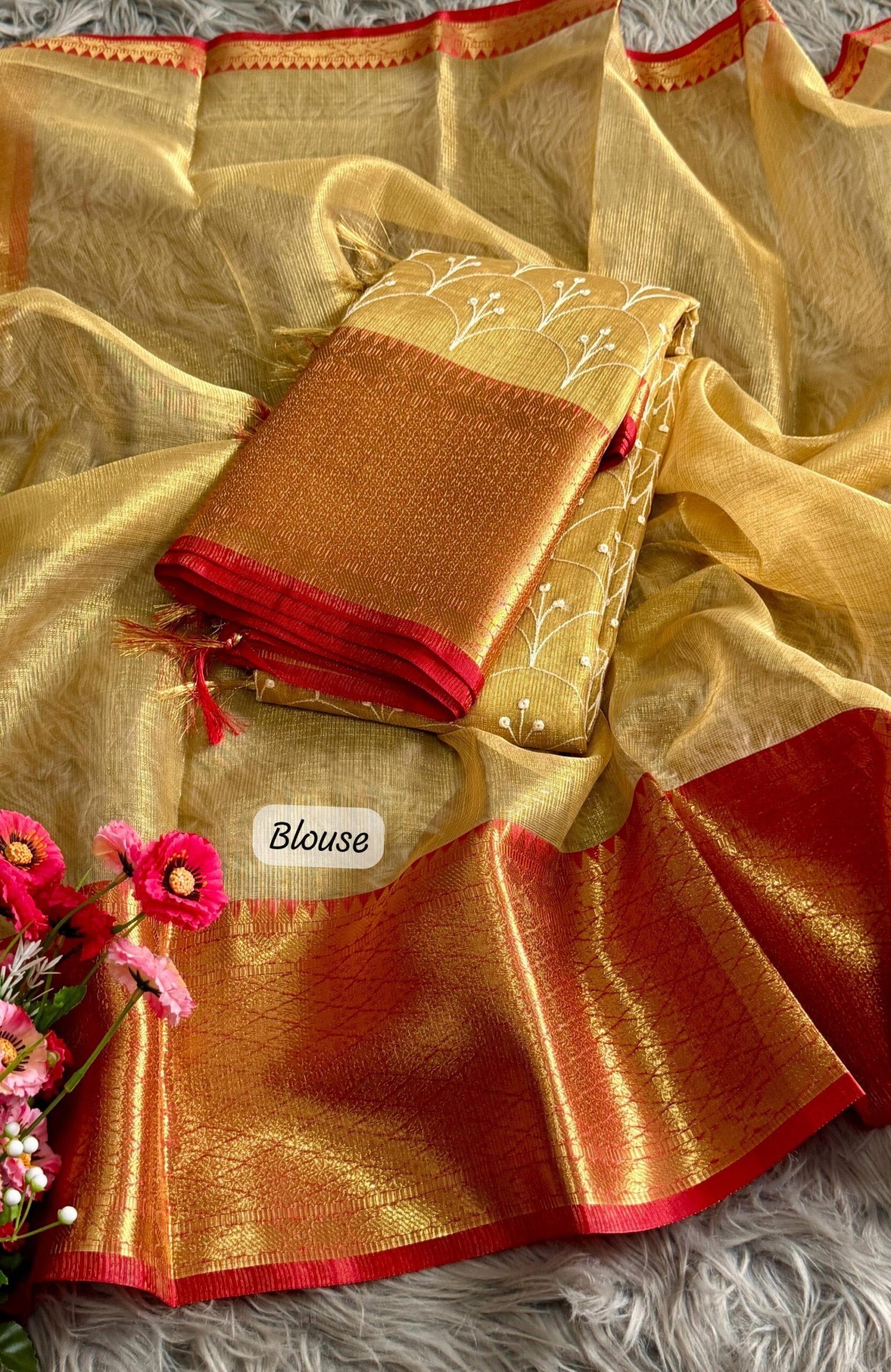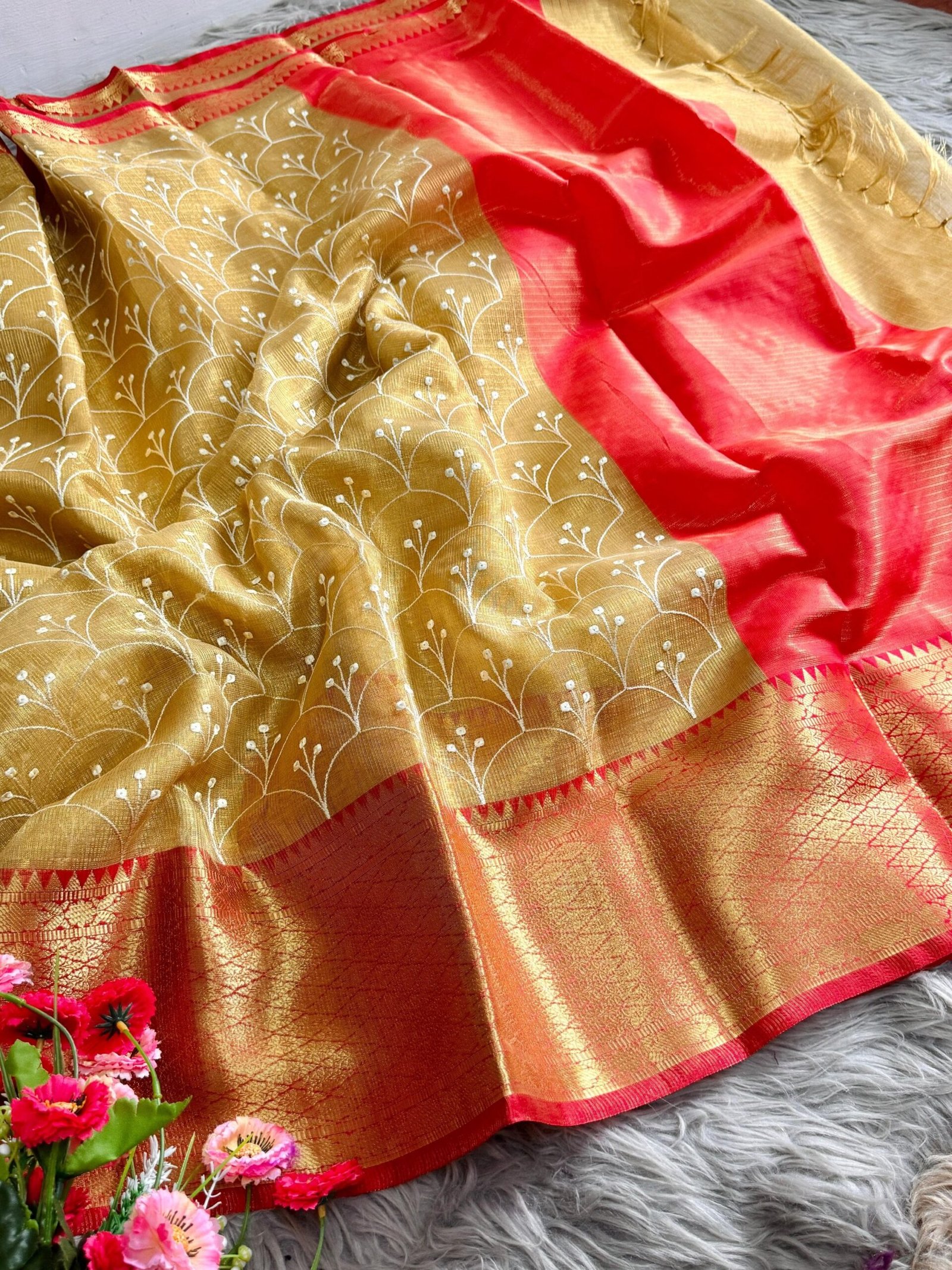 Shop grand Banarasi tissue silk saree in gold and red with embroidery and handwoven zari border. Perfect for weddings and festive wear.