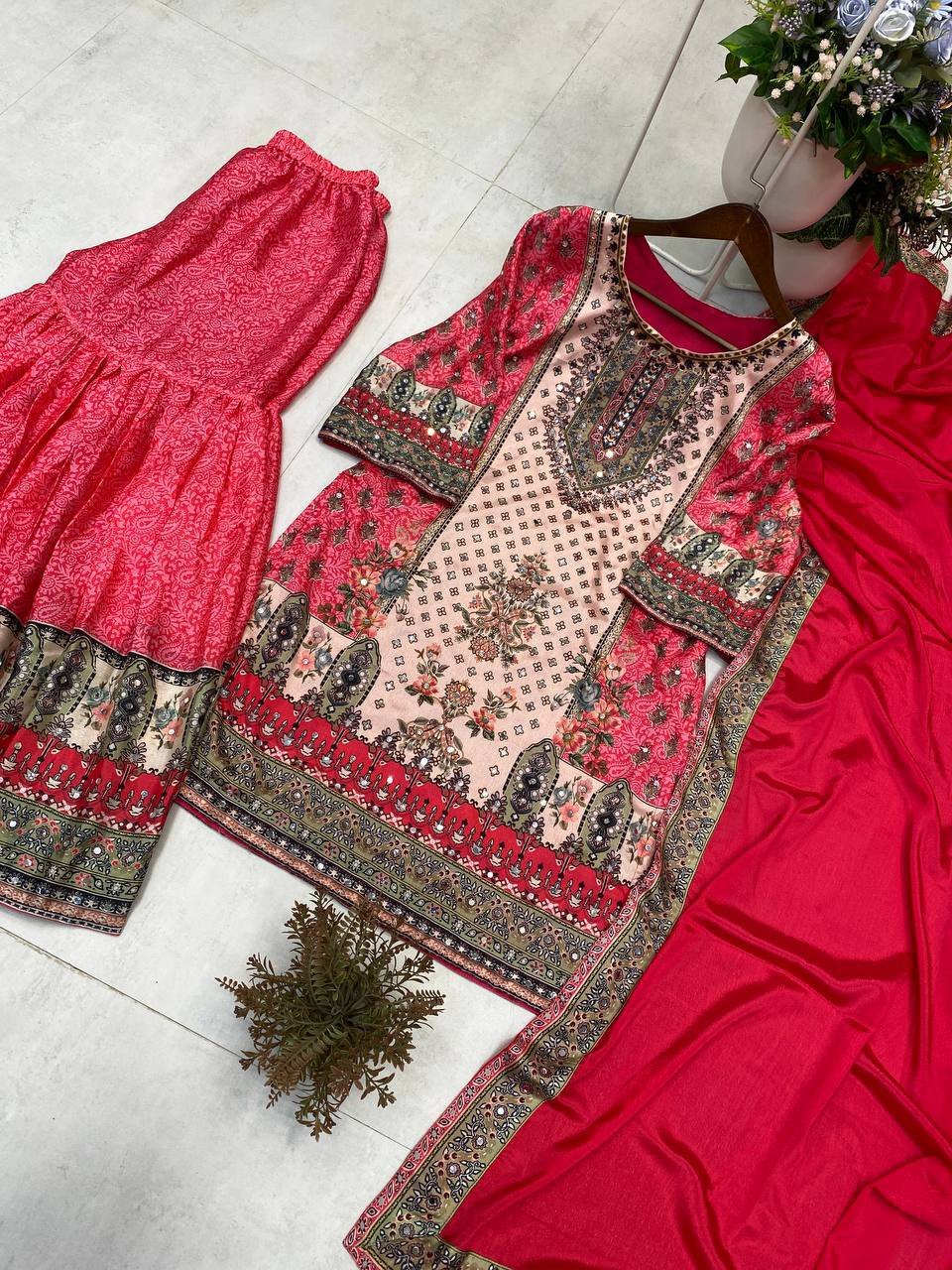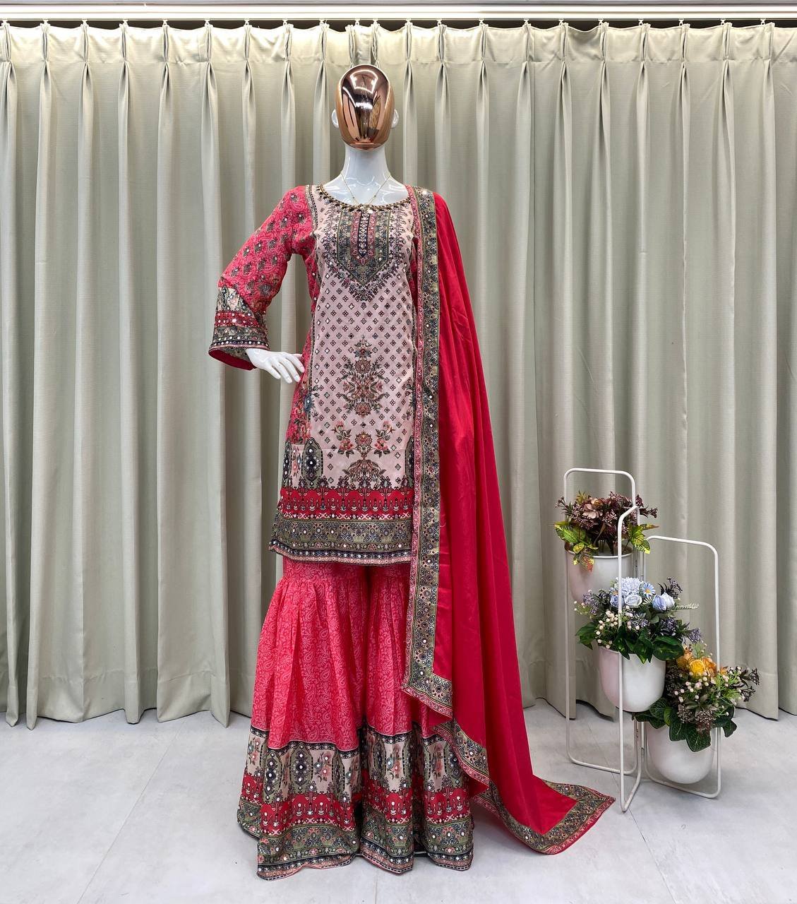 Buy Designer Chinon Sharara Set with real mirror work. Includes stylish top, free-size sharara & printed dupatta. Perfect for weddings & festive occasions.