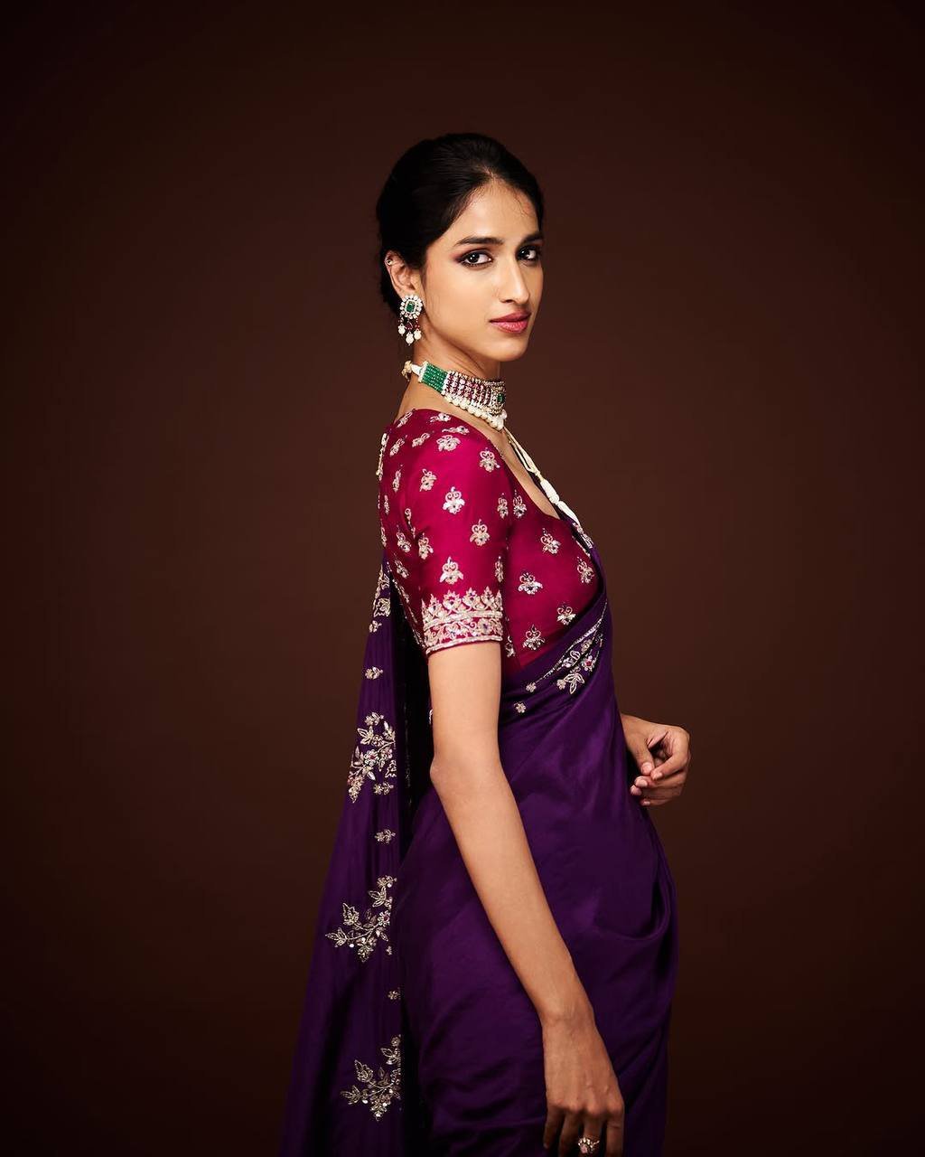 Fall in love with this richly embroidered Viscose Chinon Saree – highlighted with sequins, zari & contrast piping 💖
