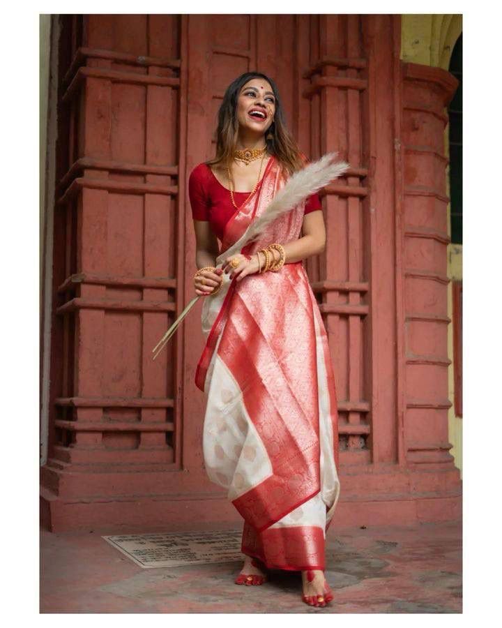 Shop elegant Banarasi soft silk saree with traditional zari work & jacquard weave. Includes blouse with exclusive jacquard border. Perfect for festive wear.