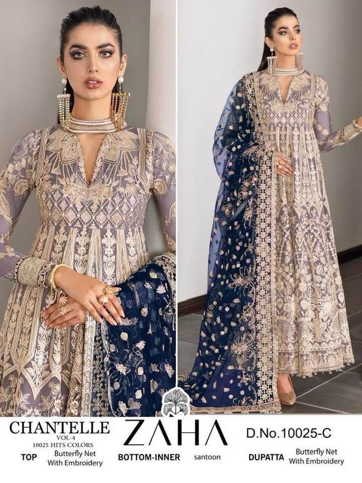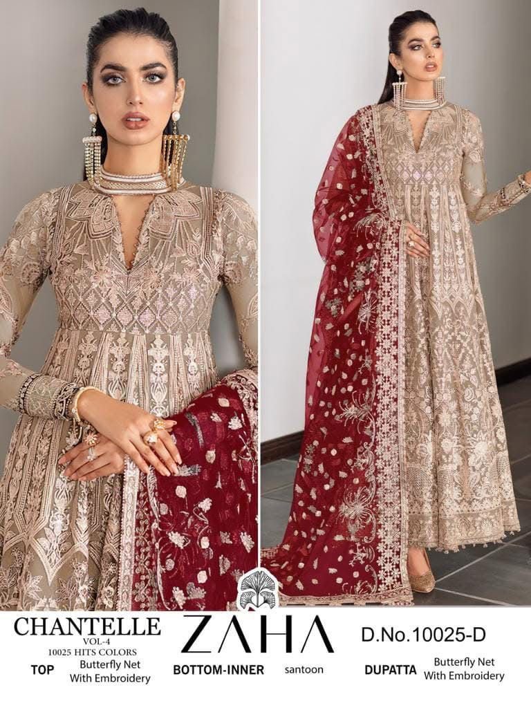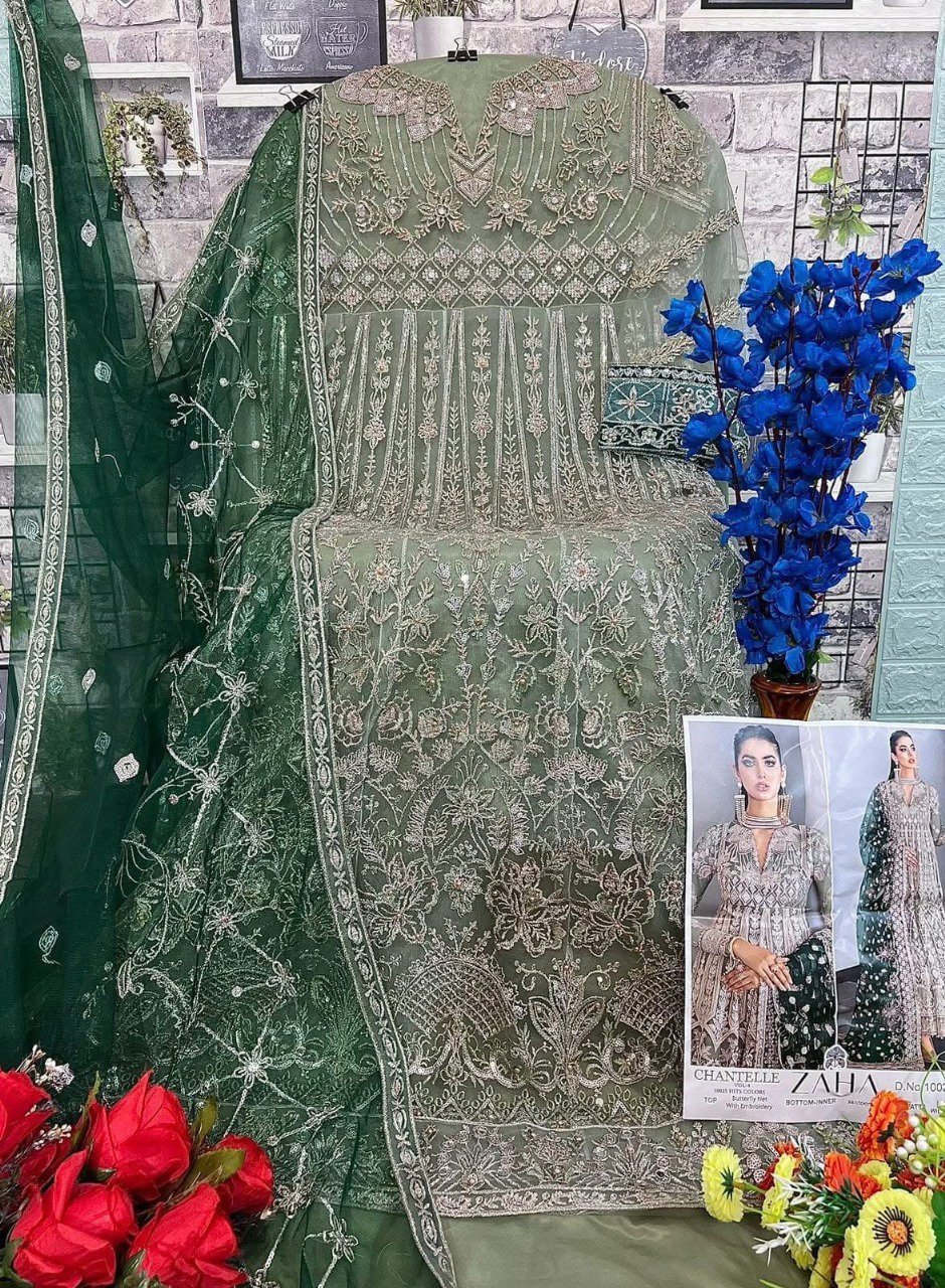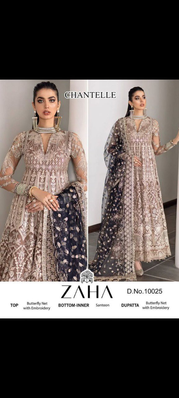 Buy Butterfly Net suit with heavy embroidery, Santoon bottom & inner, matching embroidered dupatta. Perfect for weddings & festive wear
