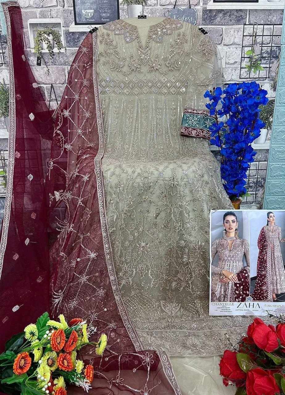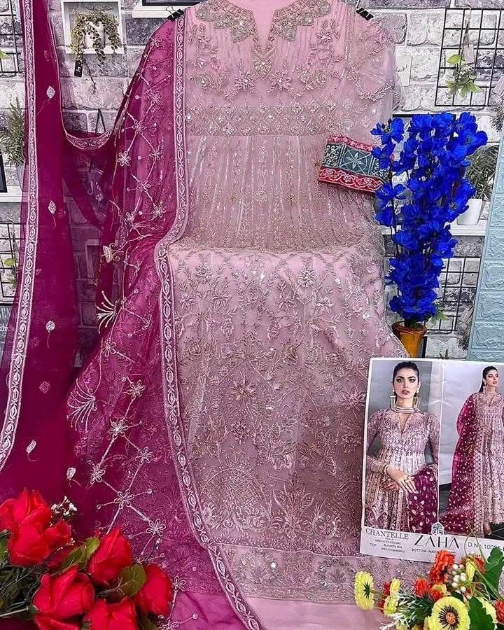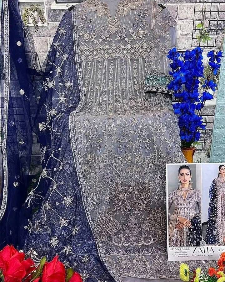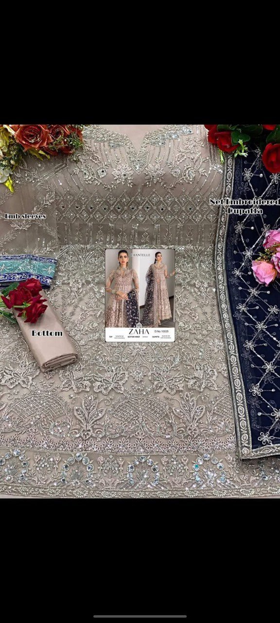 Buy Butterfly Net suit with heavy embroidery, Santoon bottom & inner, matching embroidered dupatta. Perfect for weddings & festive wear