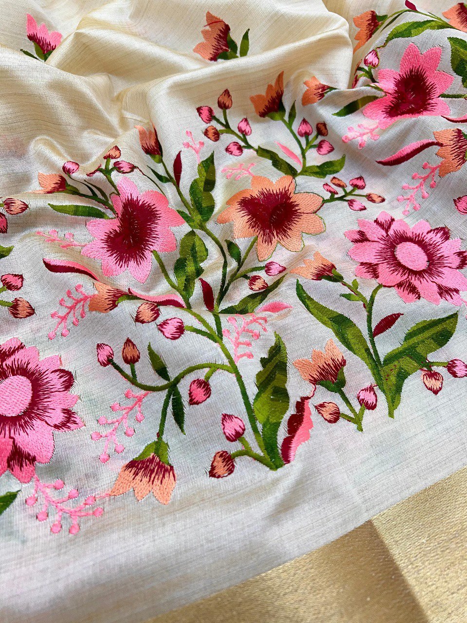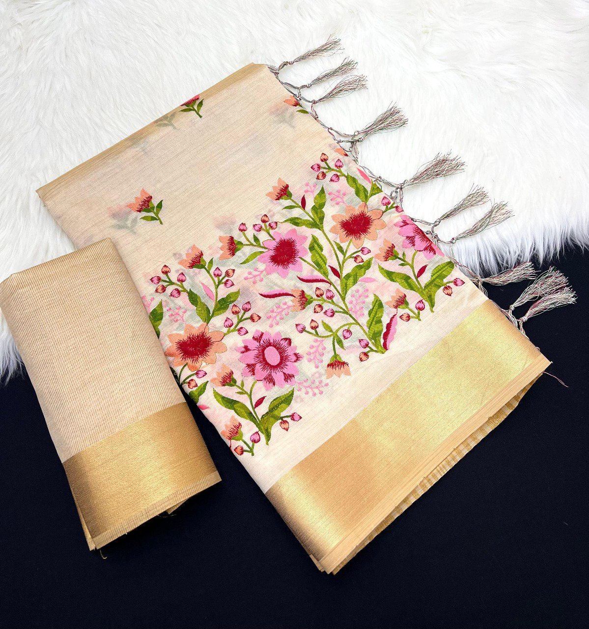 Shop soft tussar silk blend saree with floral embroidery, golden zari border & pallu, and matching blouse. Decorative tassels add charm. Ideal for festive & wedding wear.