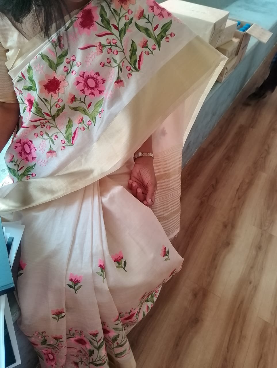 Elegant Soft Tussar Silk Blend Saree with Floral Embroidery & Zari Border