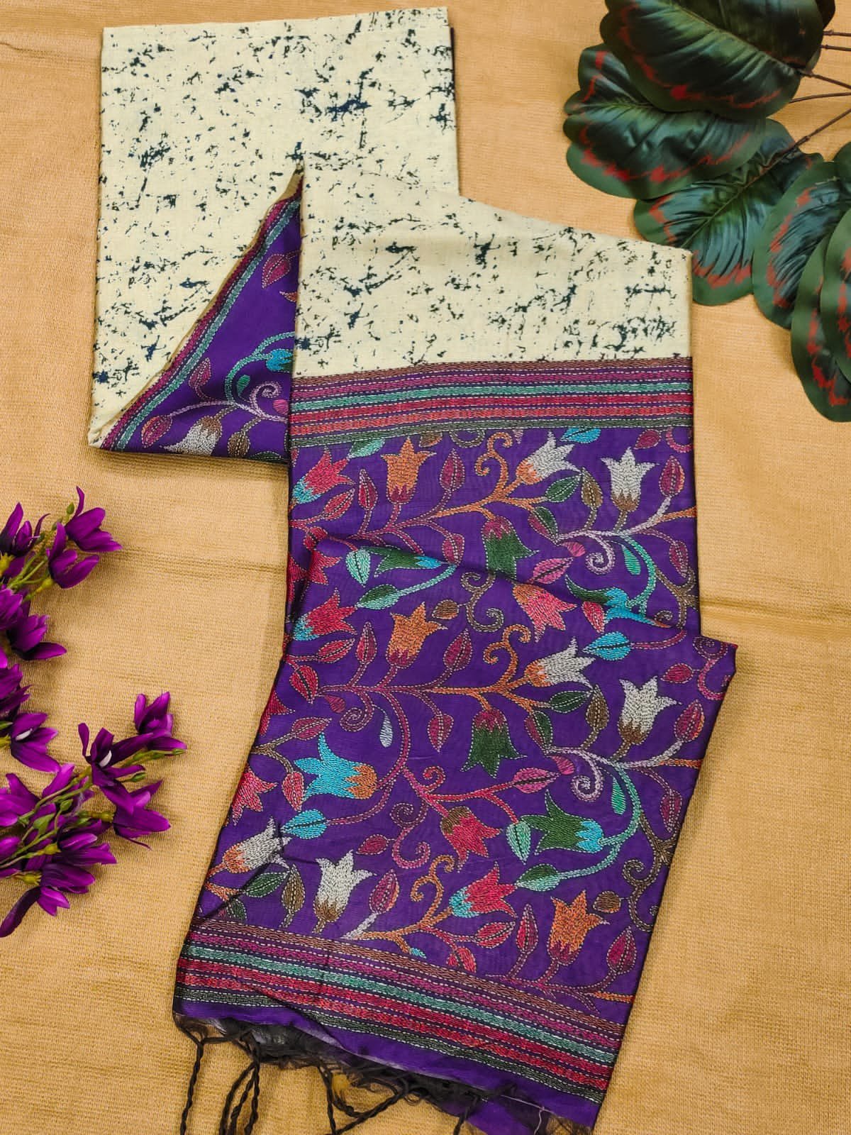 Buy Soft Tussar Silk Saree with contrast purple floral pallu & elegant beige body. Lightweight, premium silk with matching blouse piece – perfect for festive occasions.