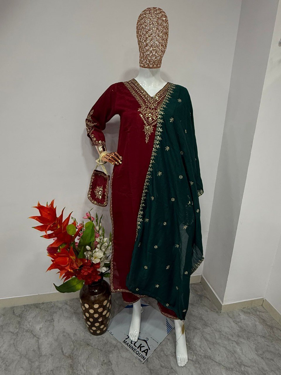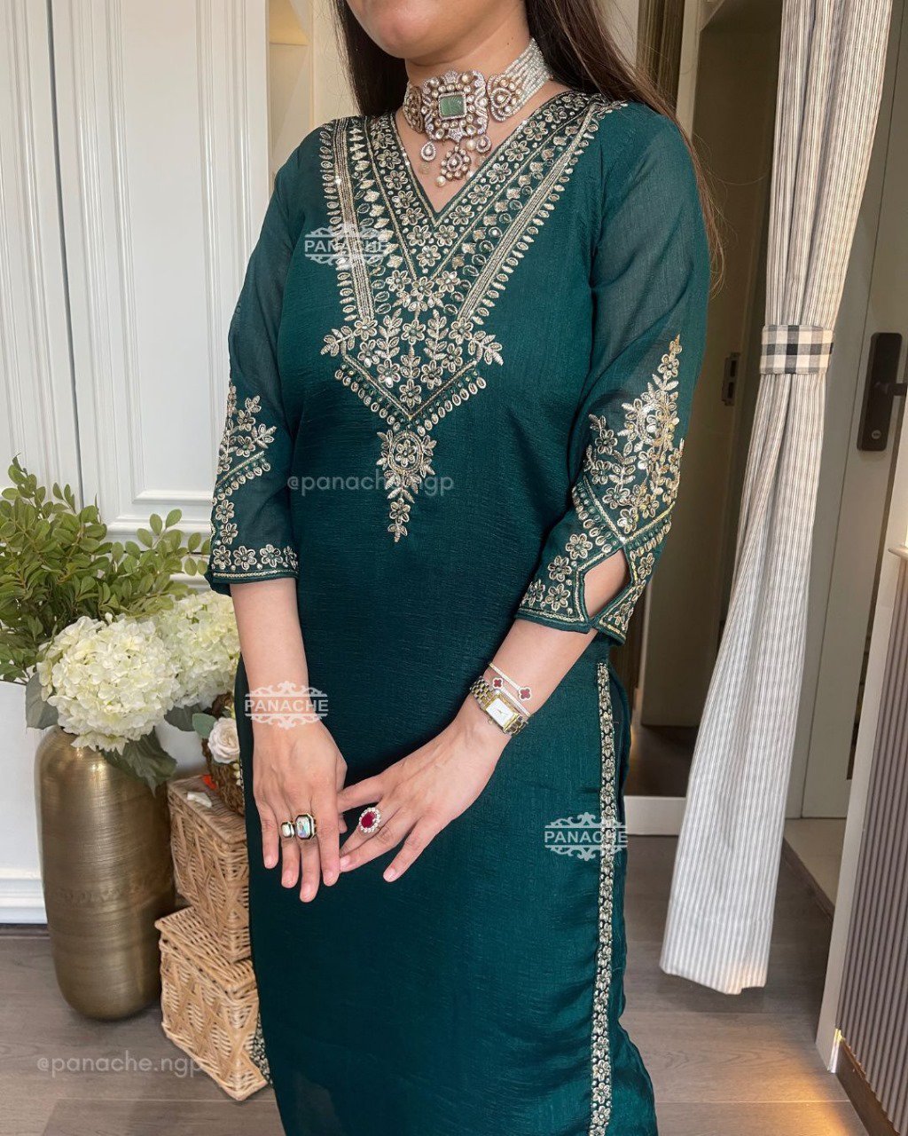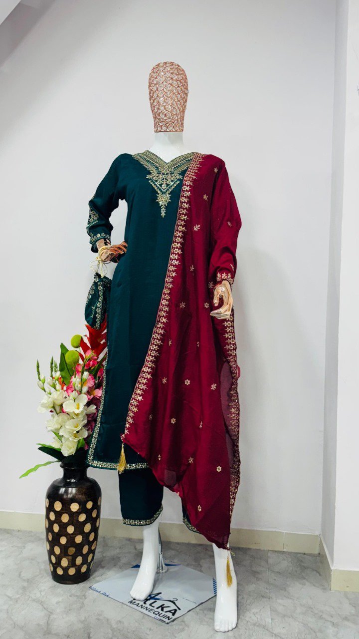 Celebrate tradition with our rich Vichitra Silk festive wear set, featuring exquisite coding work and a graceful drape.