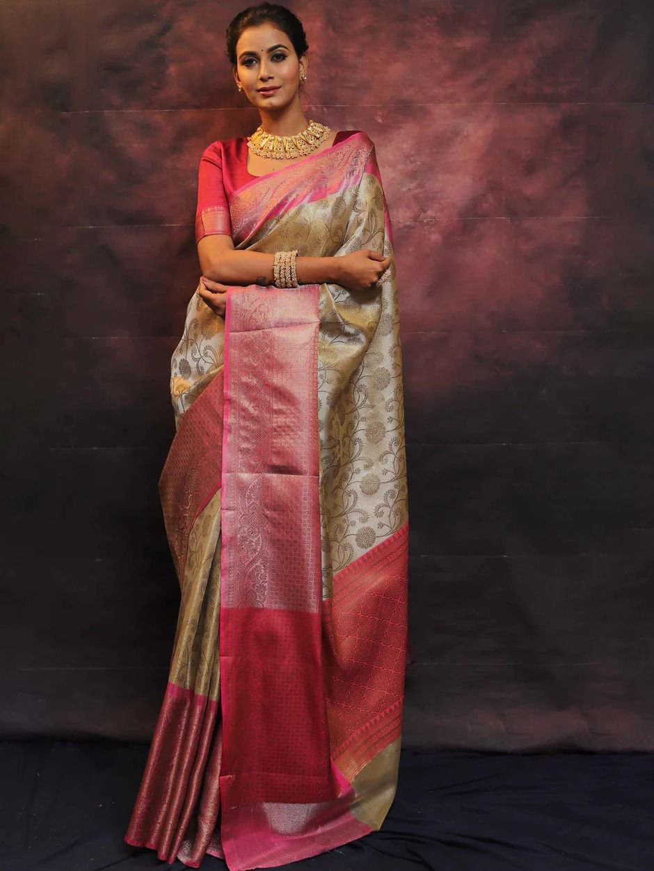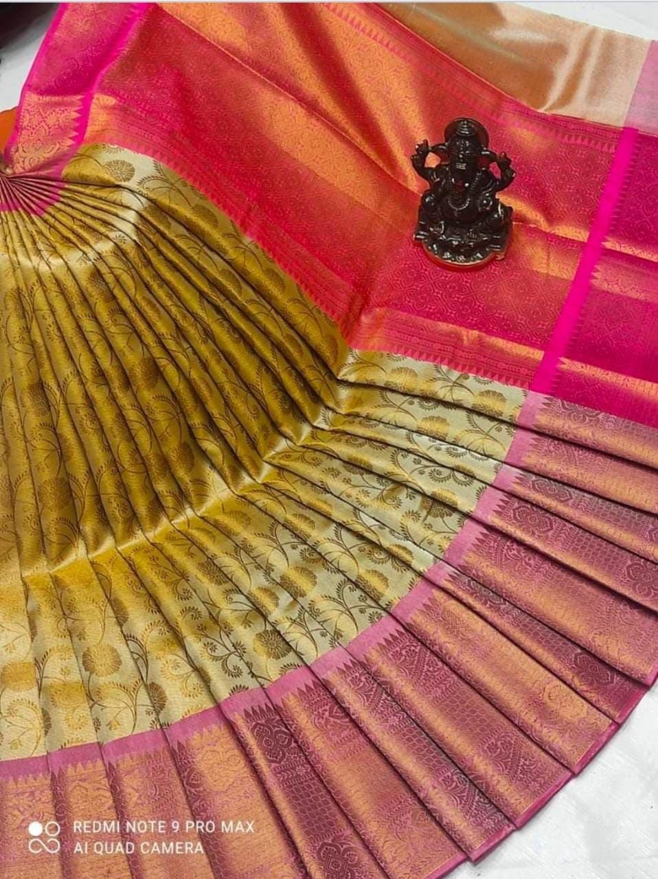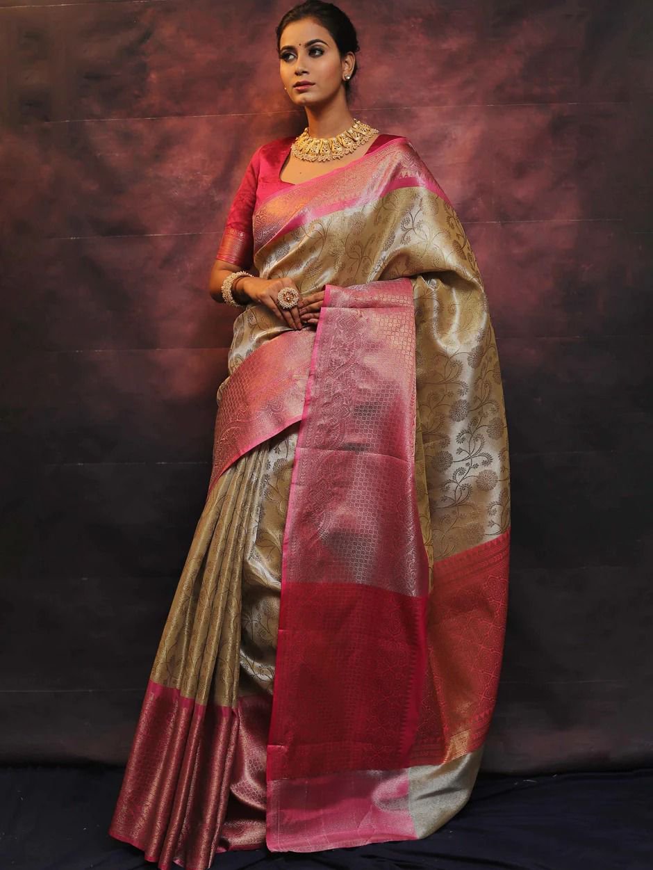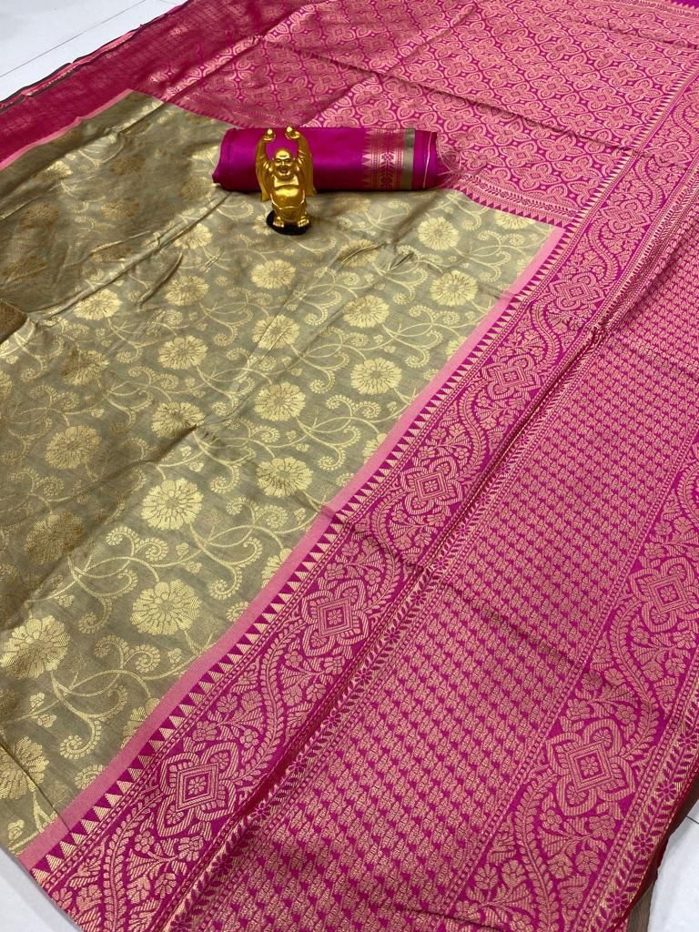 Discover our enchanting Organic Banarasi Saree in soft lichi silk with rich pallu and all-over jacquard work. Light, breathable, and perfect for weddings & festive occasions