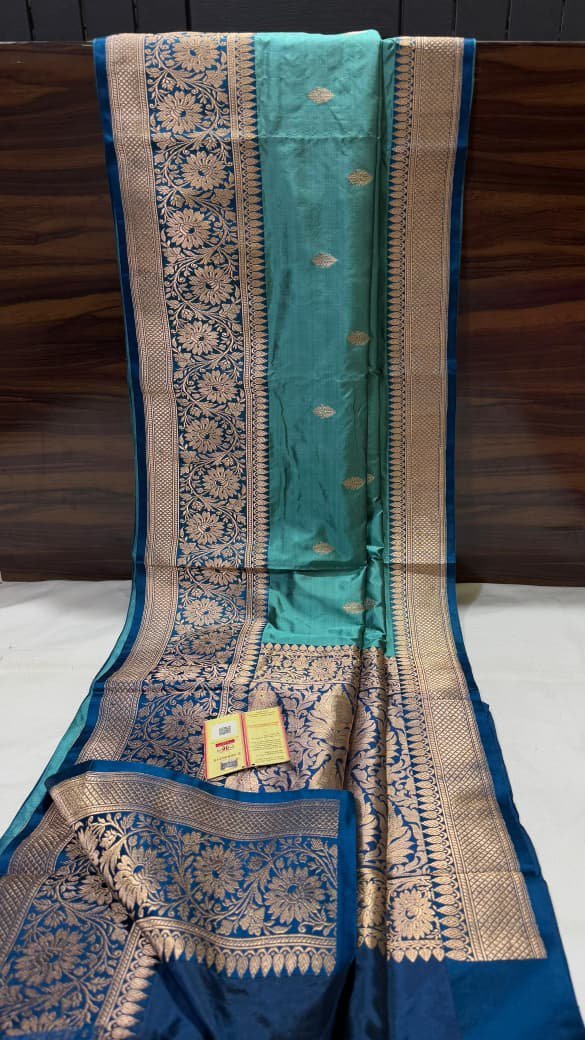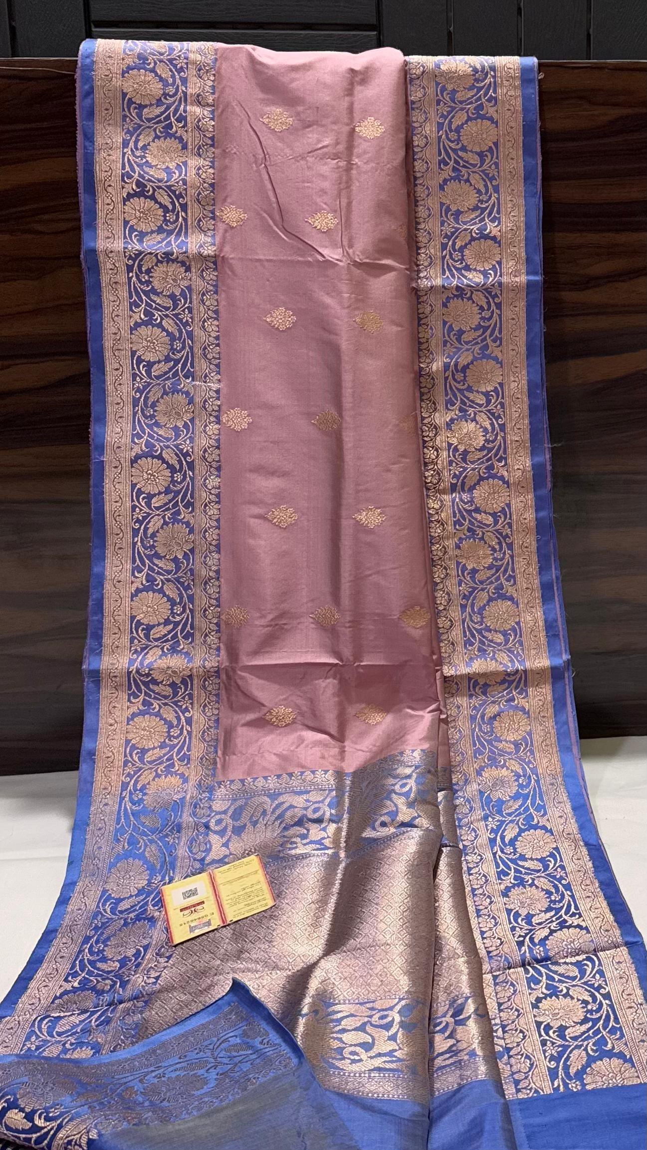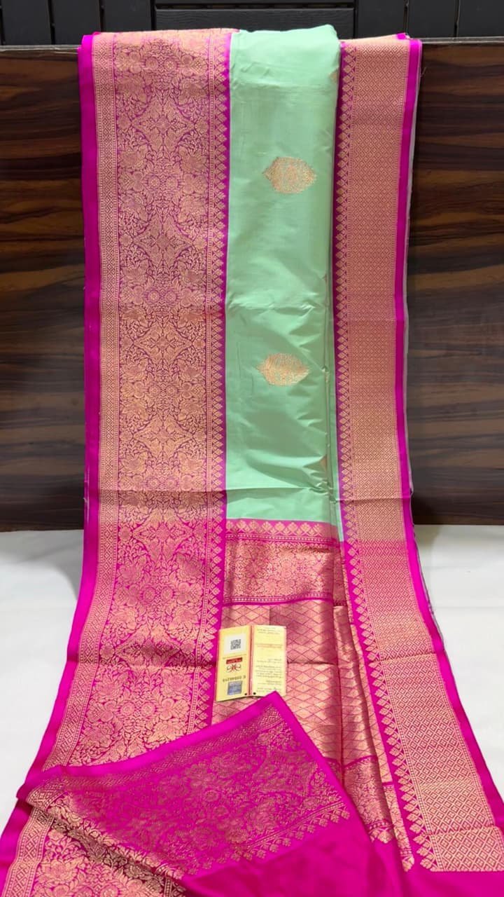 Buy Handloom Banarasi Pure Katan Silk Saree with antique zari work, contrast pallu, and matching blouse. Smooth, soft fabric ideal for weddings & festivals.