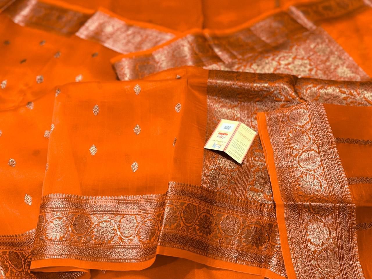 Buy pure handloom Banarasi Kora Organza Laccha saree with rich self pallu and self blouse. Smooth, soft fabric perfect for festive elegance.