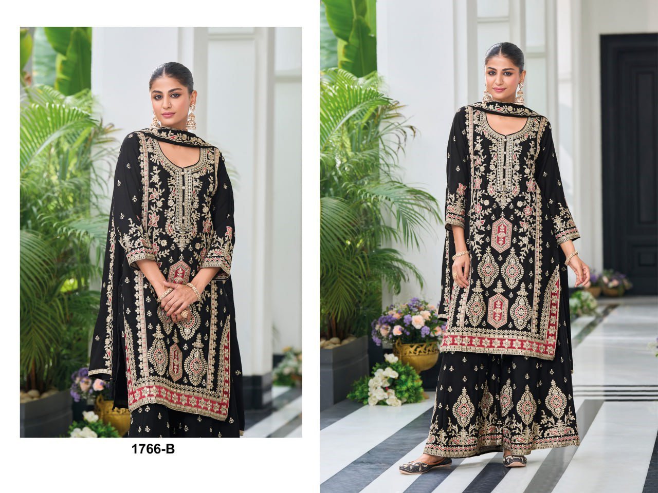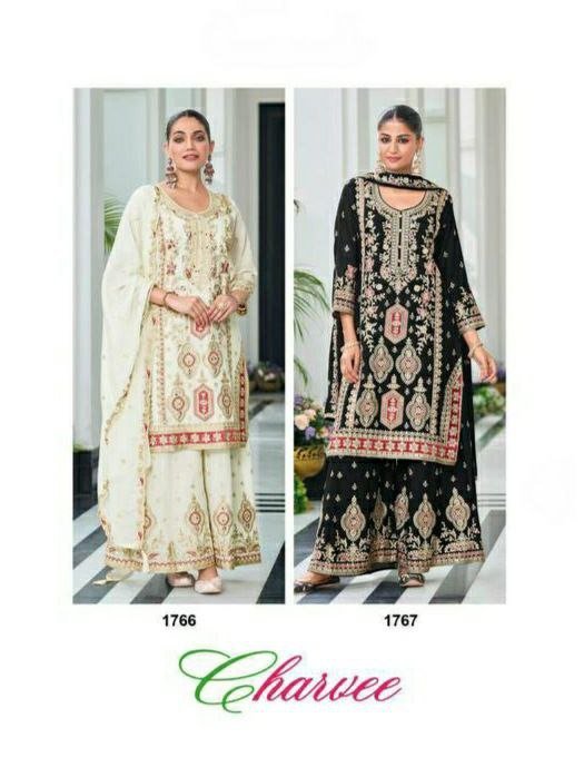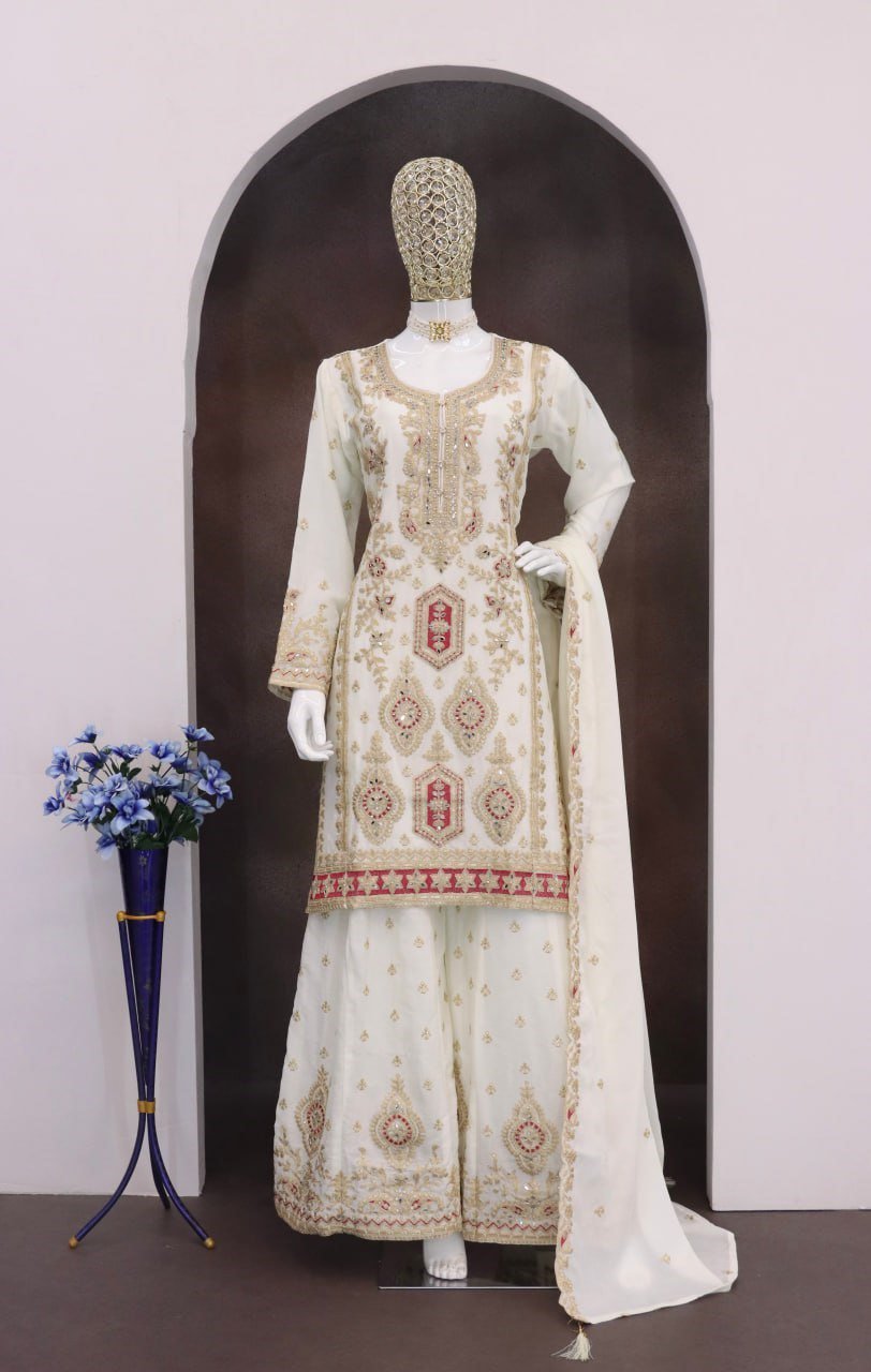 Elegant Heavy Chinon Silk Palazzo Suit with zari, sequin & zarkan embroidery. Includes dupatta & stitched palazzo. Available in XL–XXL. Perfect festive & party wear.