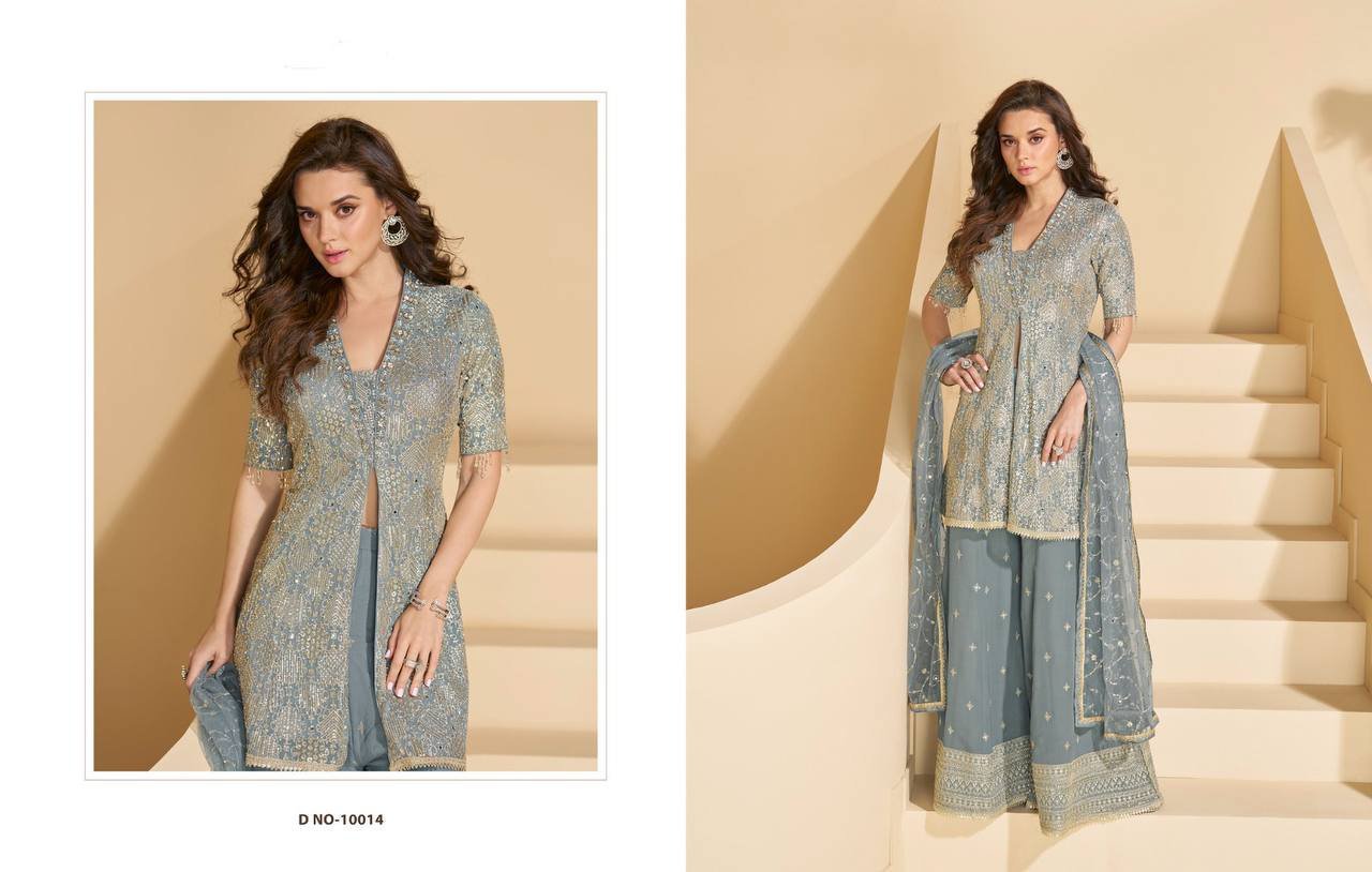 Premium Heavy Faux Georgette Silk Palazzo Suit with zari & sequin embroidery, net silk dupatta, and stitched comfort fit. Available in sizes M–XXL. Perfect festive & party wear