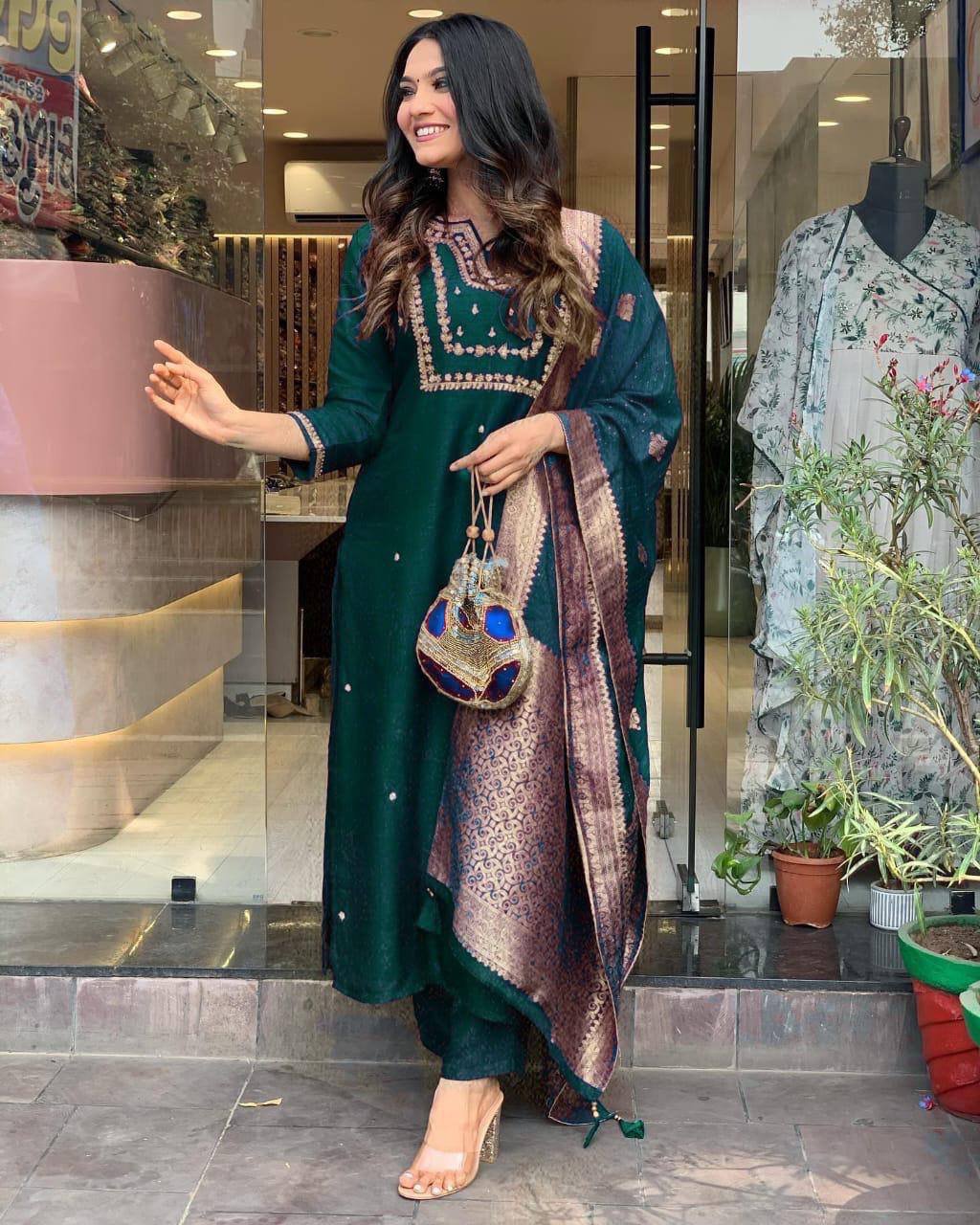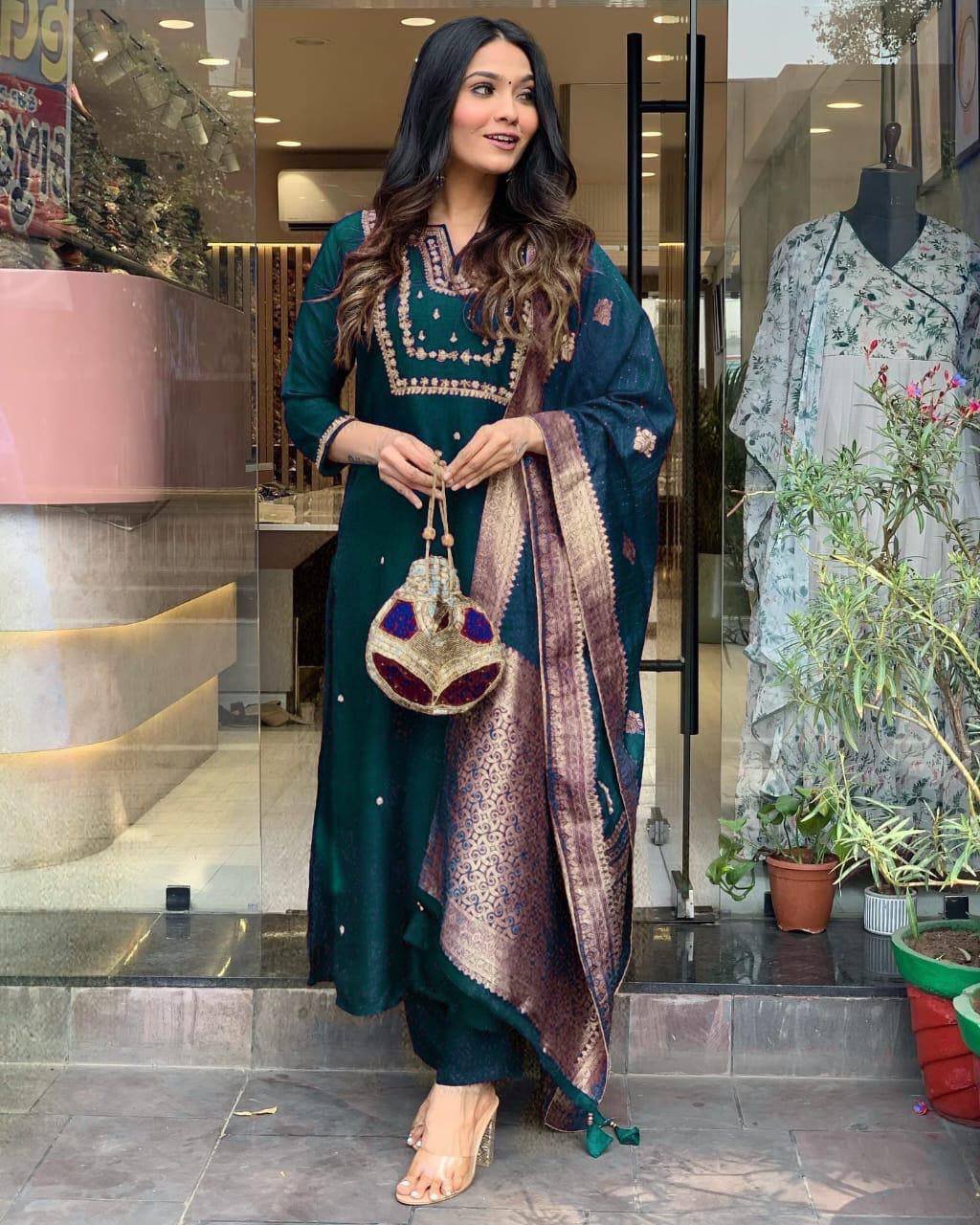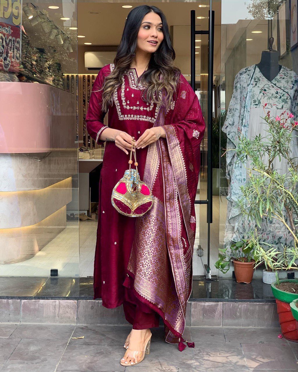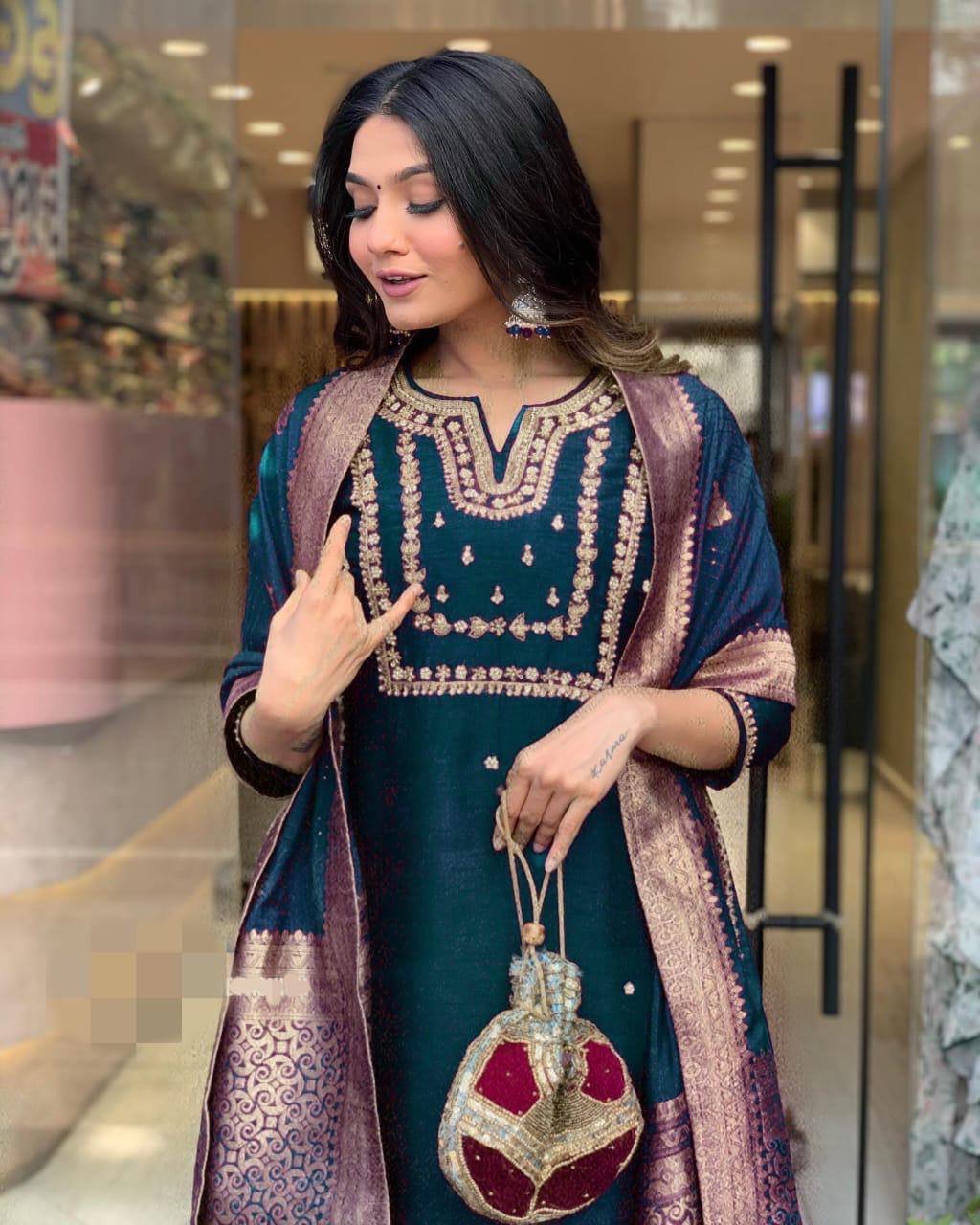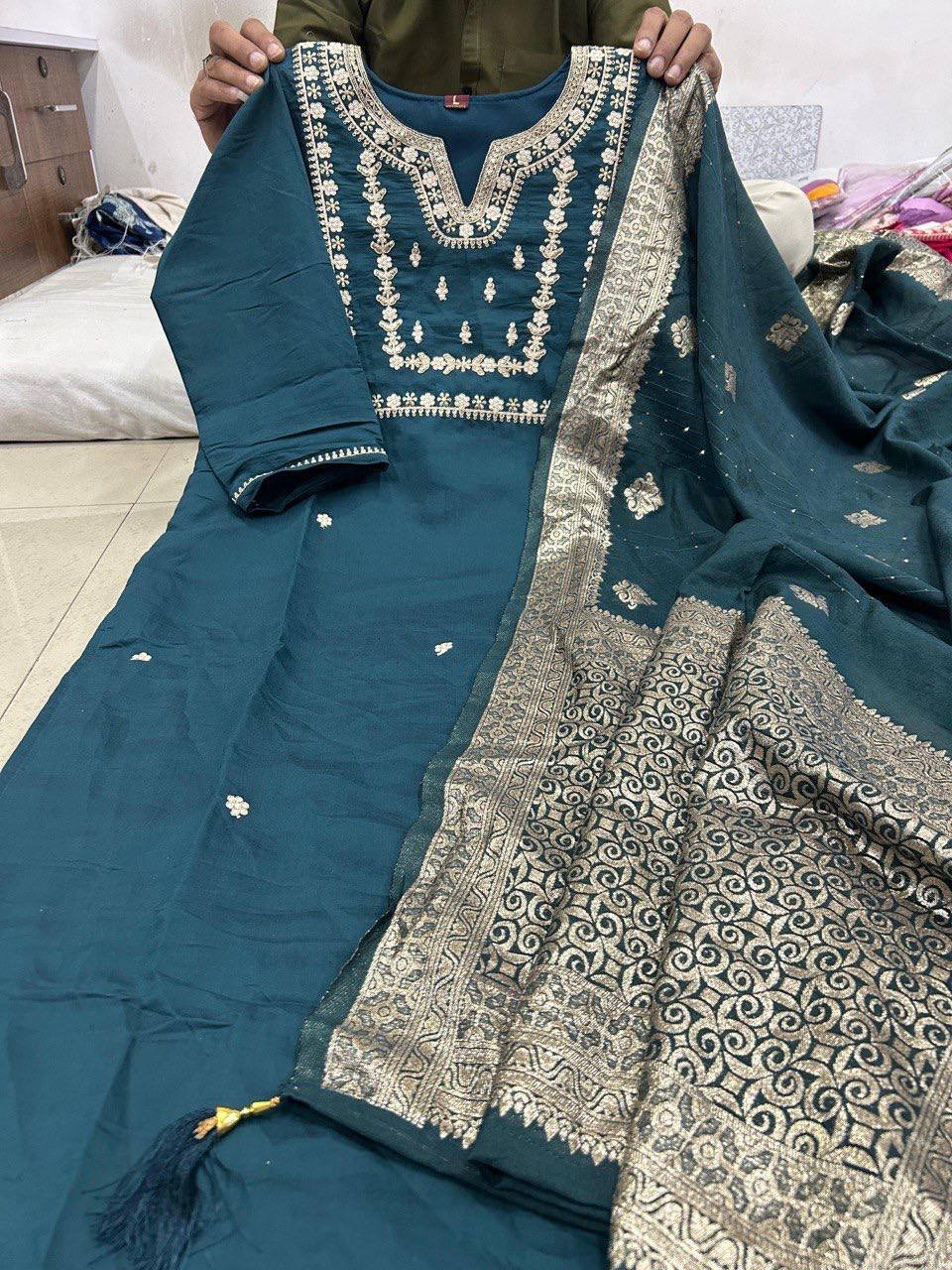 Shop heavy viscose Roman silk suit set with jacquard zari dupatta, hand embroidery & weaving. Sizes M–XXL. Perfect festive wear.