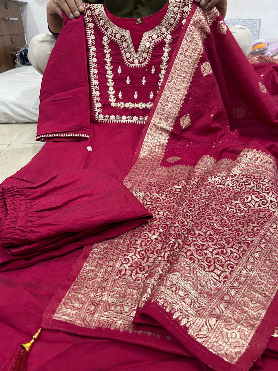 Heavy Viscose Roman Silk Suit Set with Jacquard Dupatta