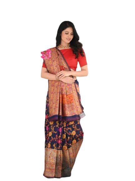 Shop Kashmiri Pashmina Saree with traditional zari work and jacquard weave. Includes 0.8m blouse with jacquard border. Perfect for weddings & festive occasions.”