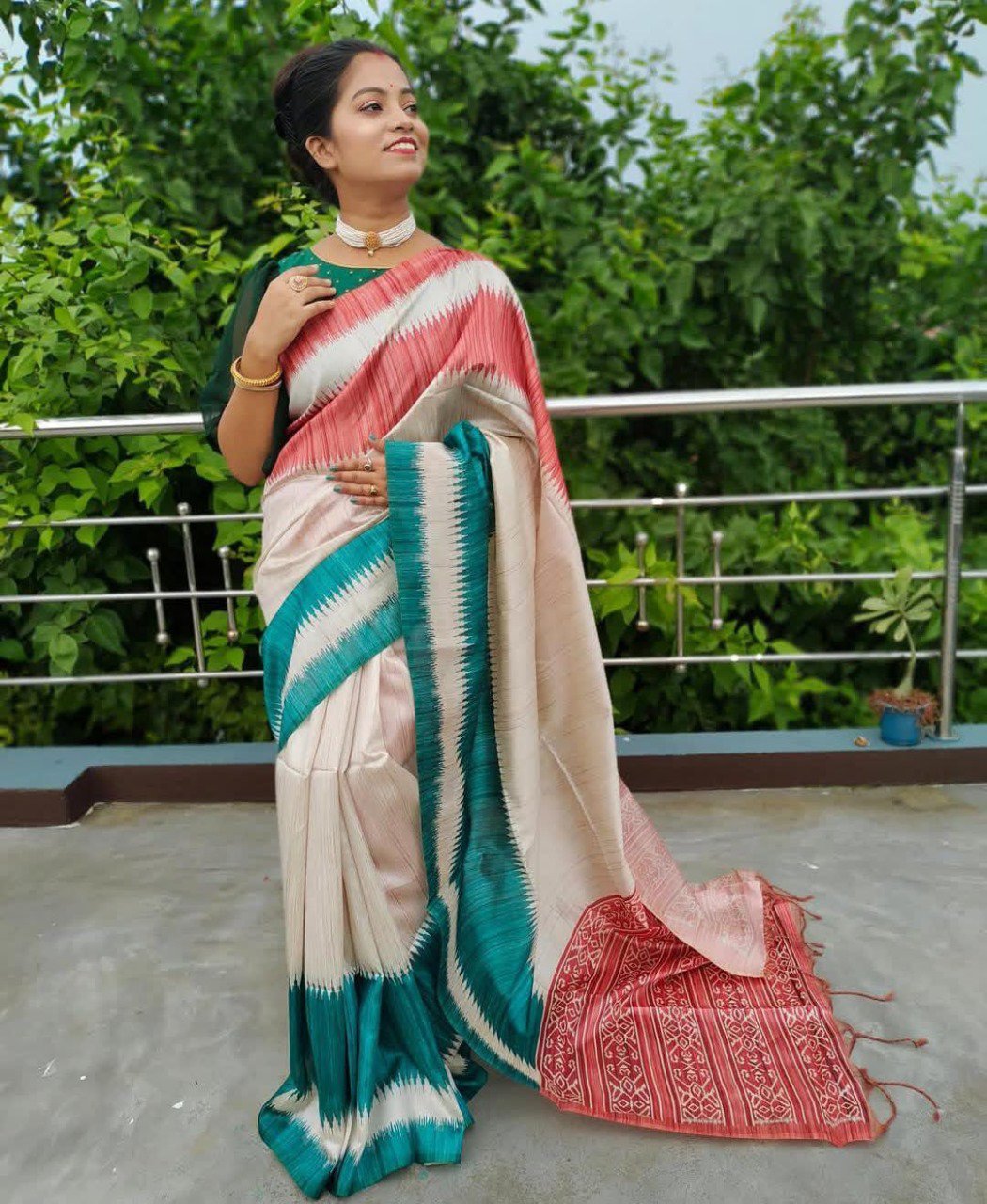 Lightweight Tussar Silk Saree with temple design, zari border, jhallar pallu & printed blouse. Elegant drape for festive & traditional occasions.