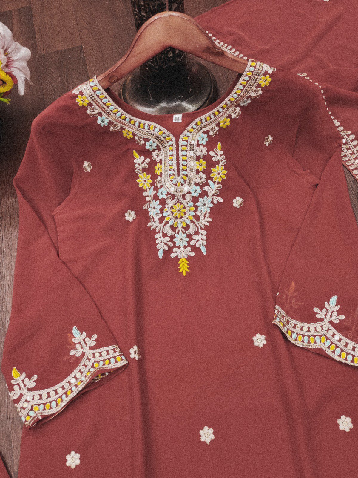 Shop New Designer Fox Georgette Sharara Suit with coding sequence embroidery, heavy embroidered dupatta & fully stitched sharara. Available in sizes S to XXL.”