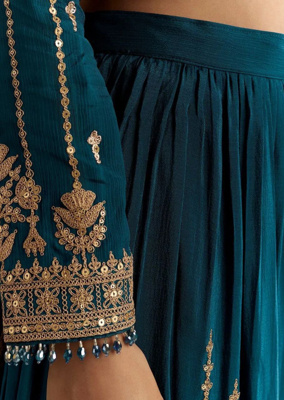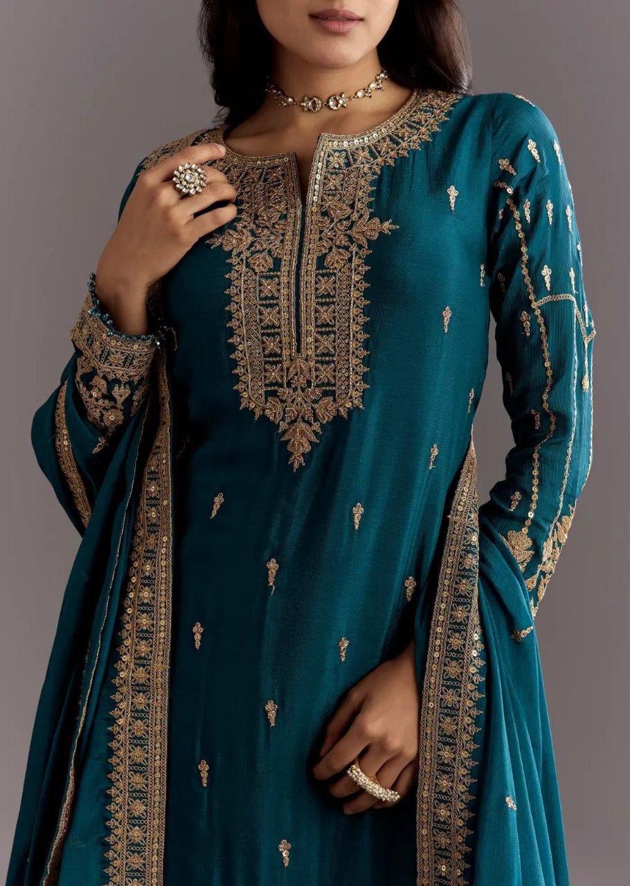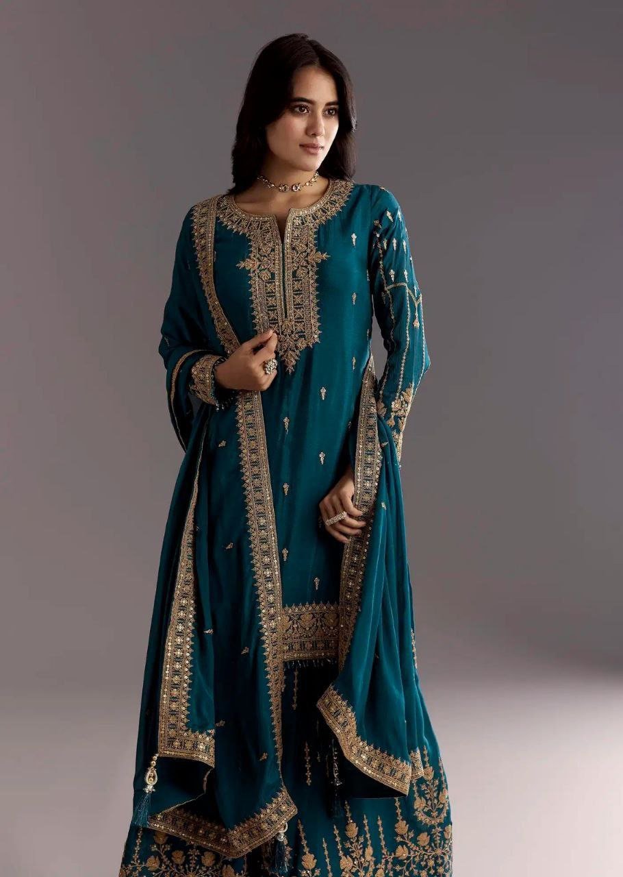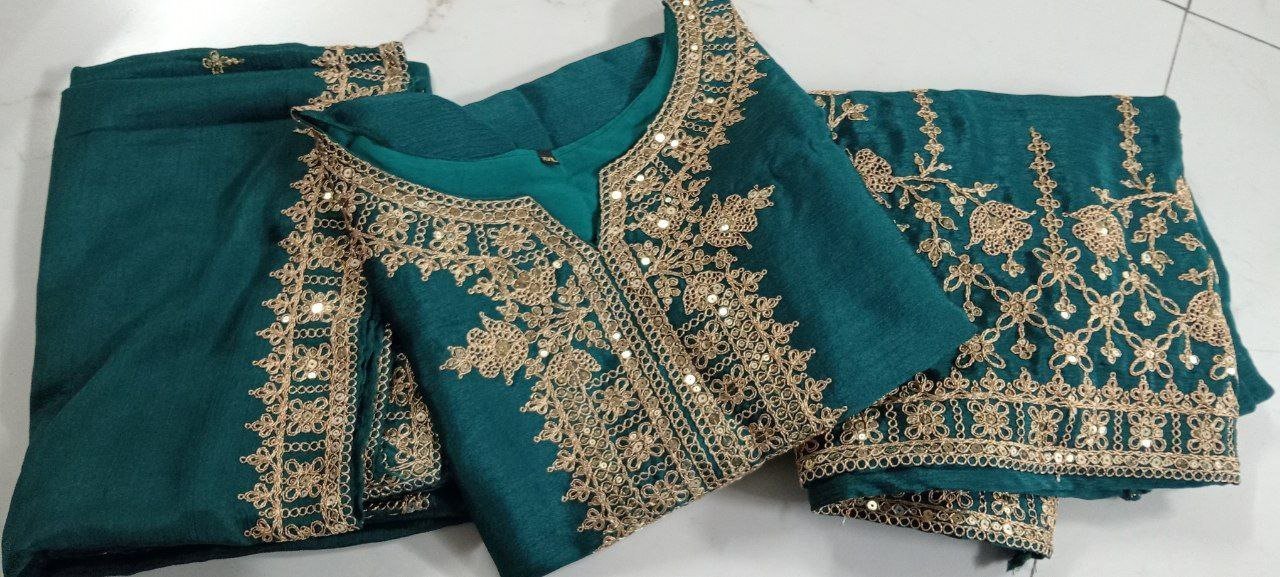 Shop premium Heavy Chinnon Silk Suit with rich embroidery, coding sequence & mirror khatli work. Comes with embroidered top, bottom & dupatta. Perfect festive & wedding wear.”