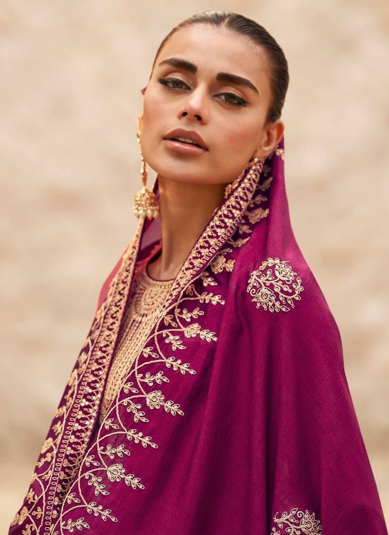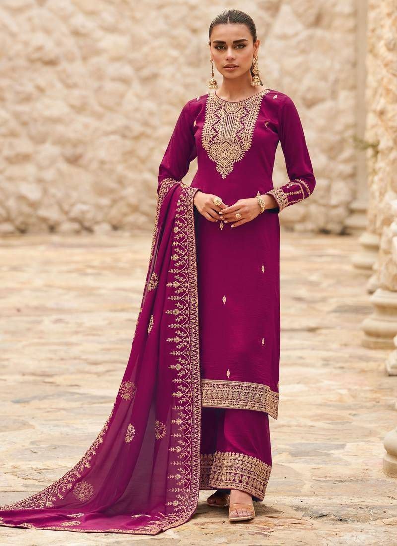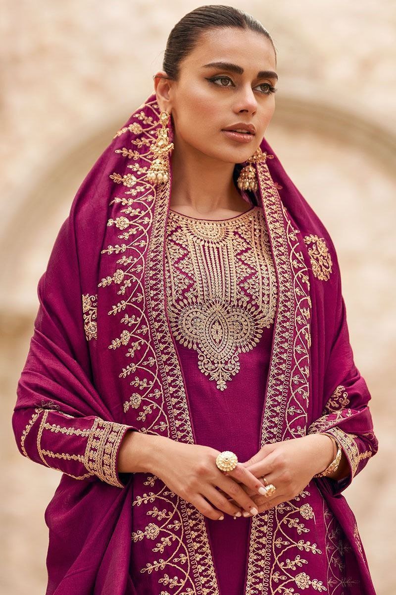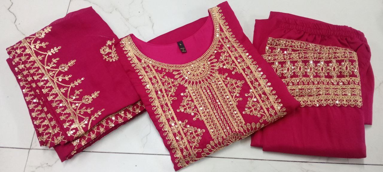 Premium Heavy Vichitra Silk Suit with zari, dori & sequence embroidery work. Comes with embroidered top, bottom & dupatta. Perfect festive & wedding outfit.”