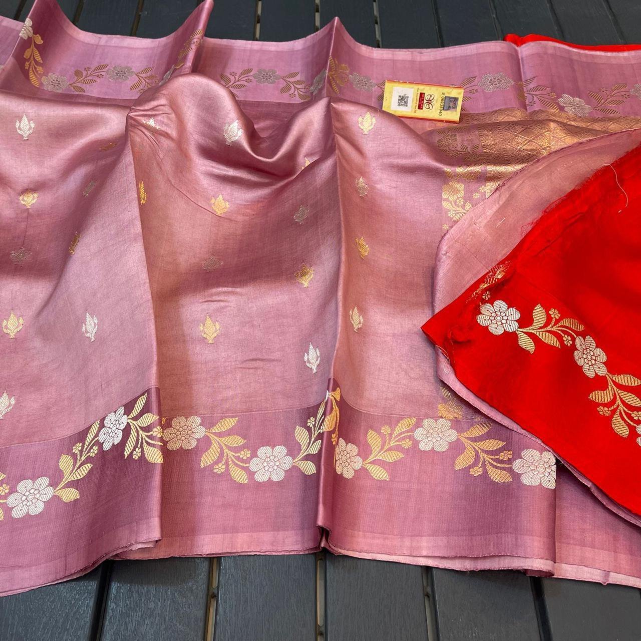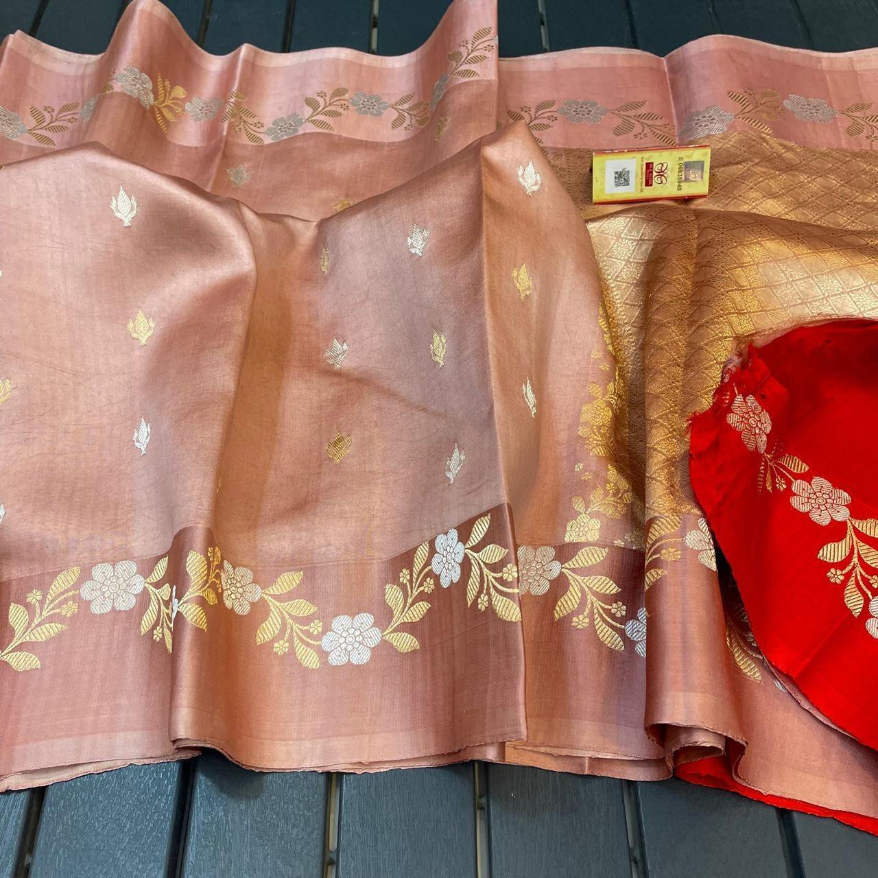 Shop Pure Raw Mango Silk Saree with all-over zari weaving and dyeable fabric. Customized in any color. Silk Mark Certified. Premium quality and timeless elegance.