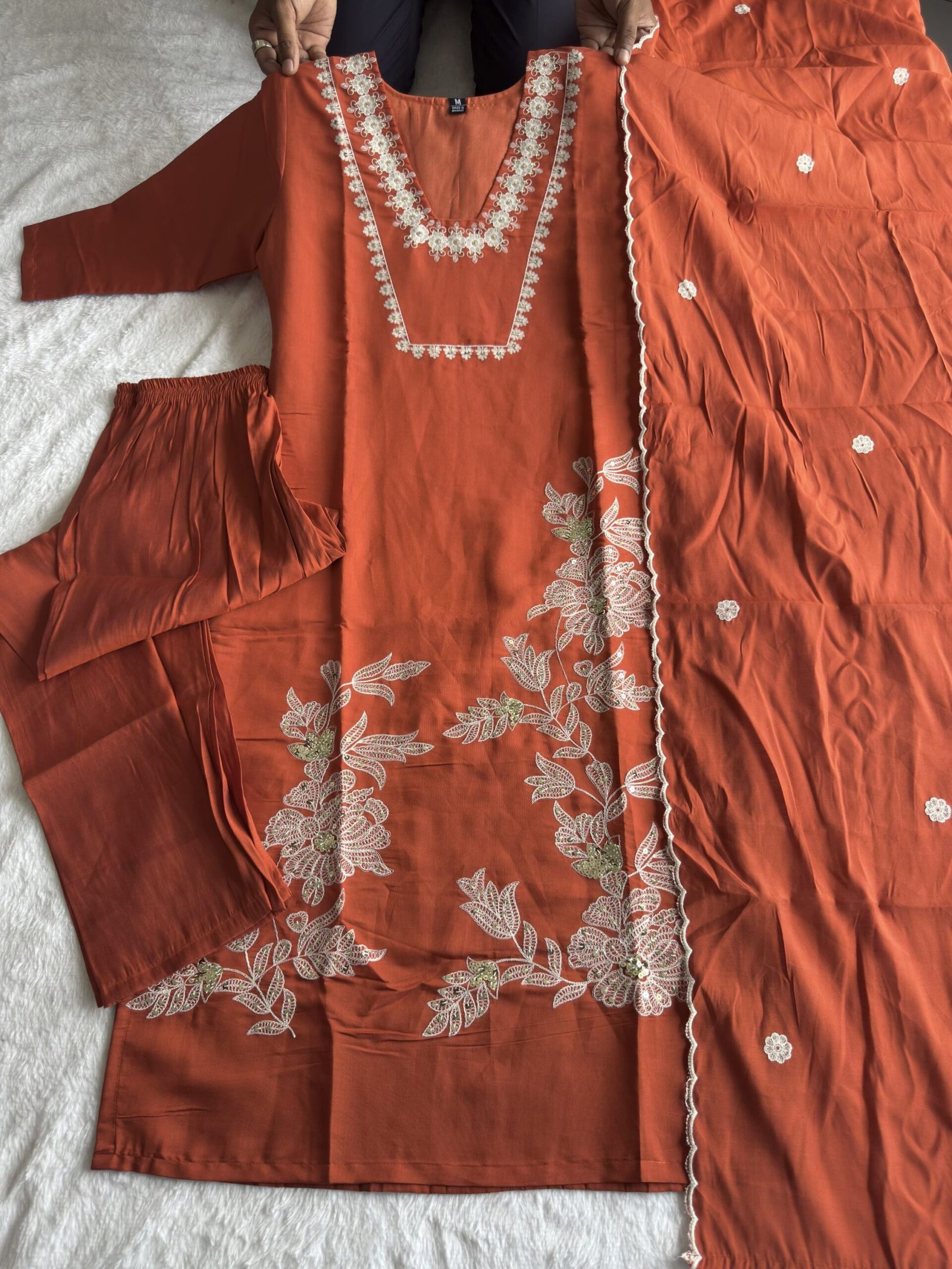 Premium Roman Silk | Rust Color | Embroidery with Sequin Work | Dupatta 2.3m | Cotton Inner | Sizes M to XXL