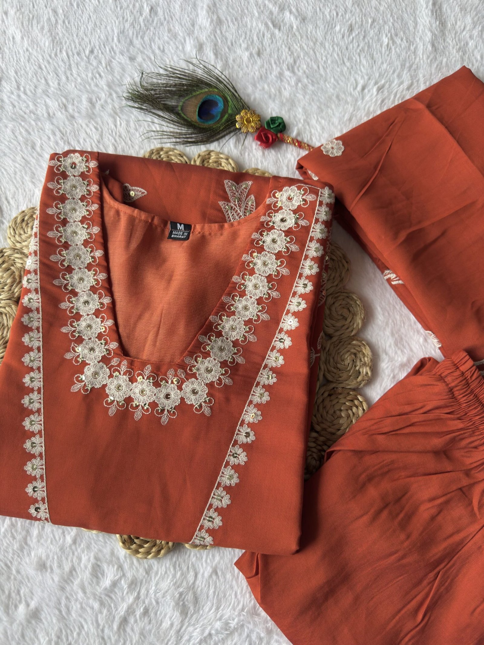 Premium Roman Silk Embroidered Kurti Set (Rust Color)