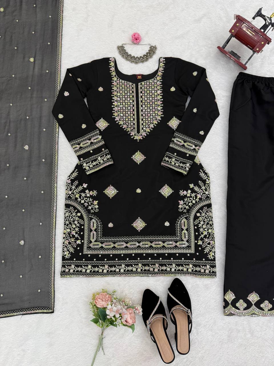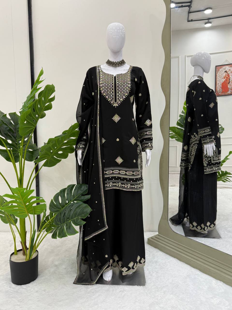 Shop Premium Roman Silk Sharara Set with thread & sequin embroidery. Includes stitched top, elastic sharara & georgette dupatta. Sizes M to 3XL. Ready to ship