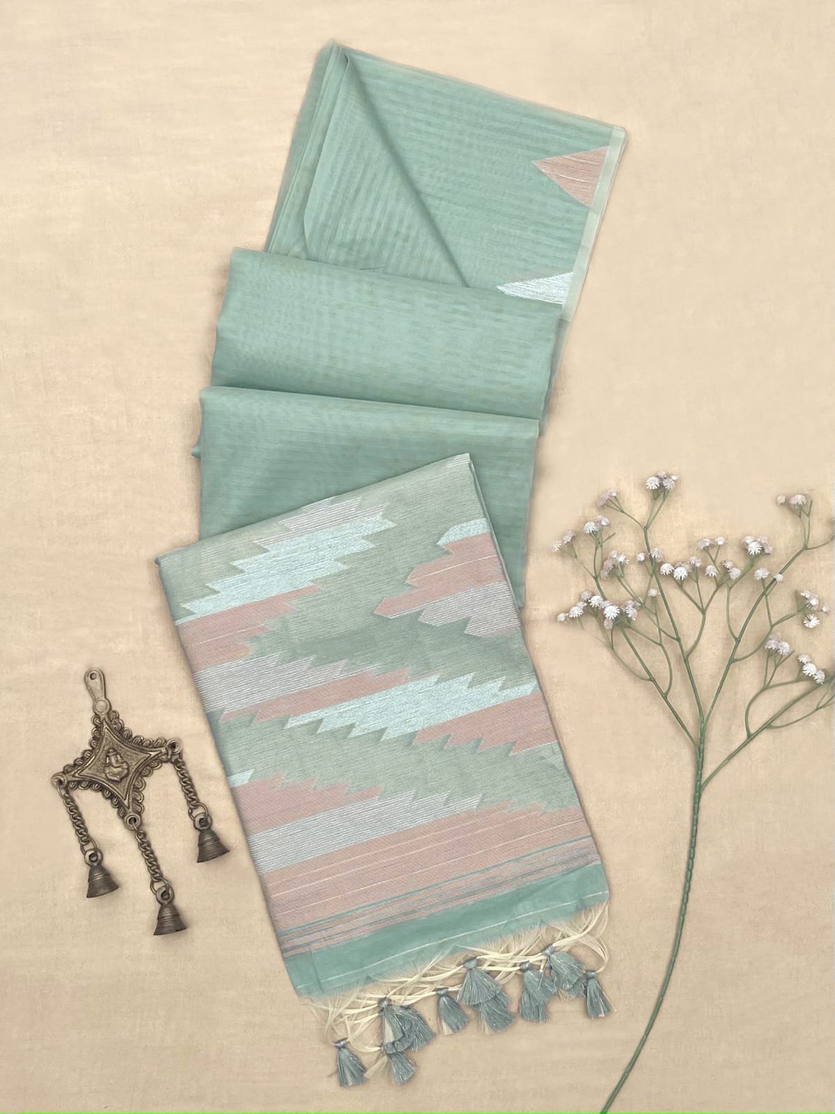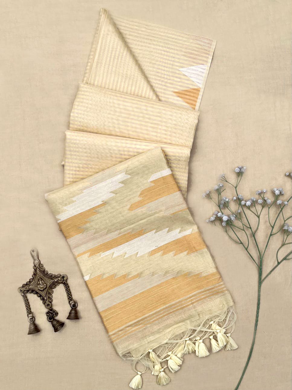 Shop the Premium Soft Mul Cotton Saree with resham pallu, temple border, and self-weaving lining. Lightweight & elegant with a contrast blouse – ideal for casual and festive wear.