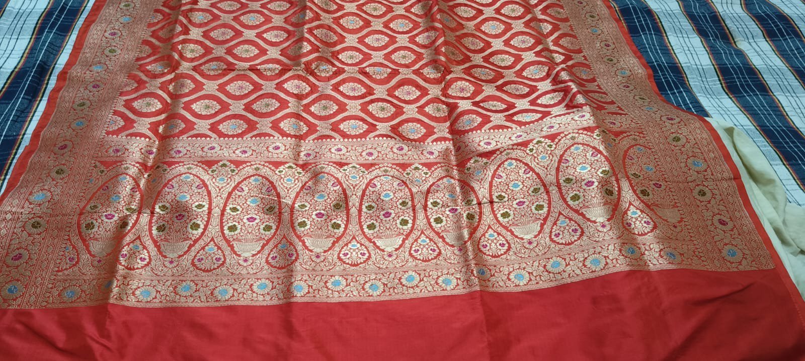in vibrant orange. Crafted from luxurious pure katan silk, it features intricate gold and silver zari work, weaving together buta and jaal motifs. With a 5.5-meter length and a matching 1-meter blouse fabric, this saree promises timeless sophistication for any occasion.