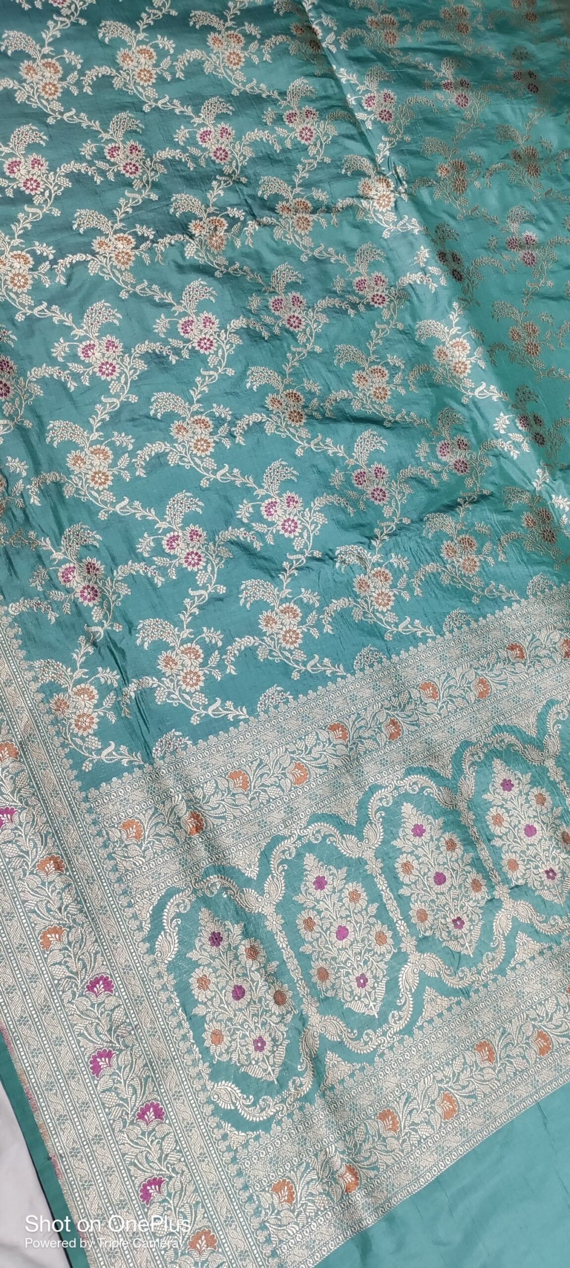 pure katan silk saree Introducing our Pure Katan Silk Saree in elegant green with intricate gold zari work. Crafted from fine Katan silk, it boasts a mesmerizing floral jaal pattern with alfi and Meena detailing. Perfect for special occasions, it comes with a matching blouse for a complete look. Elevate your style with this timeless masterpiece.