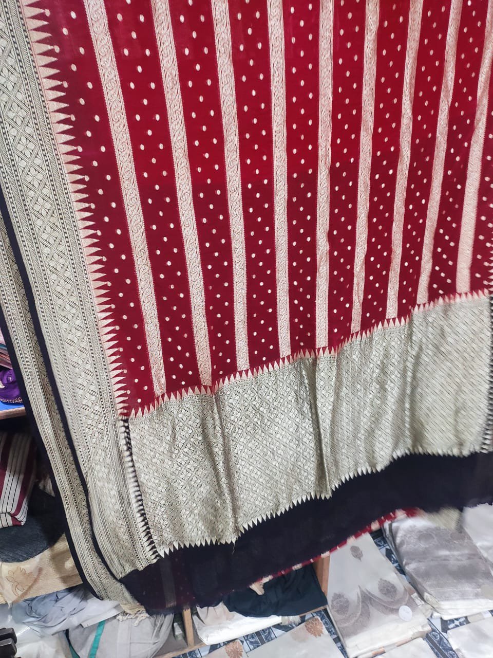 Introducing our stunning Khaddi Georgette Saree, crafted from pure Khaddi Georgette fabric in a captivating blend of multi-red and navy blue hues. Adorned with intricate gold zari work and featuring a classic lining weaving design, this saree is perfect for any occasion. Complete with 5.5 meters of saree length and 1 meter of blouse fabric, it offers both elegance and versatility. Elevate your style with this timeless masterpiece.