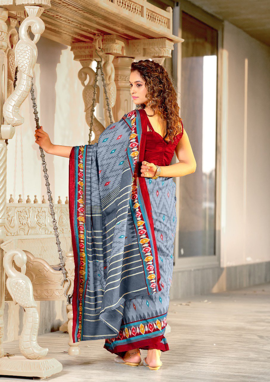 Shop pure mulmul cotton ikkat hand block print saree with matching running blouse piece. Soft, breathable fabric with elegant traditional look.