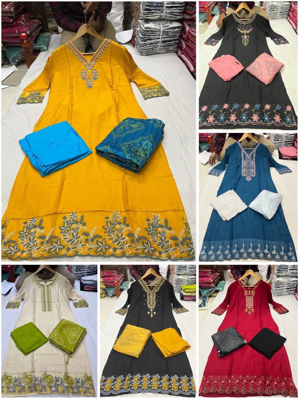 Rayon Embroidered Suit Set with Bandhani Dupatta